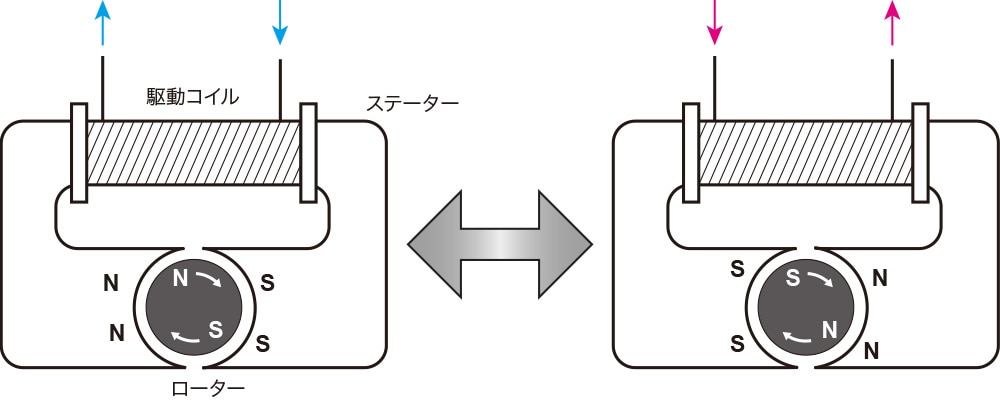 そこで、駆動コイルに流れる電流の向きを逆にすると、ステーターのN極とS極が反対になります。