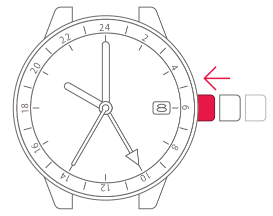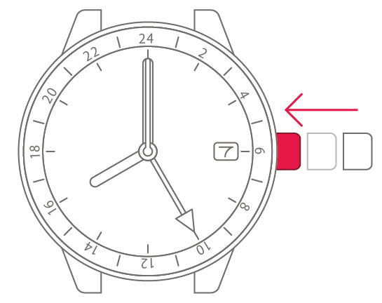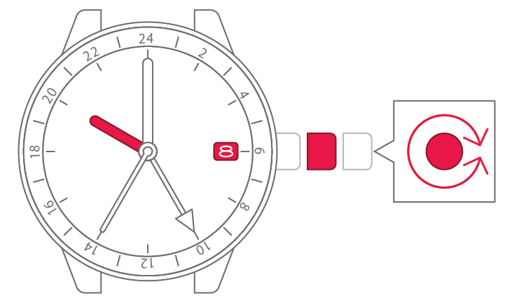 日表示が切り替わる途中で、りゅうずを逆に回さないでください。日付が正しく表示されなくなります。