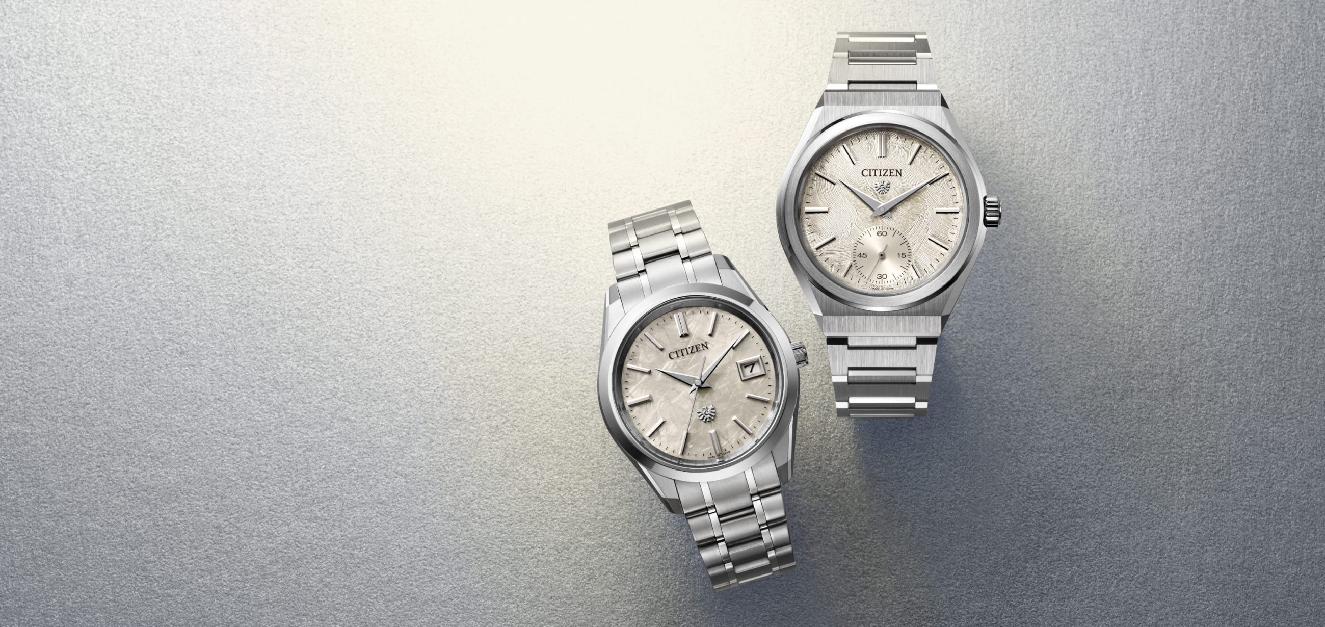 メカニカルモデルCaliber 0200は、これまでも高度な金属転写技術である「電気鋳造」手法を用いた独創的な文字板に挑んできました。今回はアイボリーカラーの文字板に、The CITIZENのシンボルである「イーグル」の羽を模したパターンを電鋳で施し、落ち着いた色味の中に躍動感のある仕上げを実現。さらに、直線的なインデックスや針と、曲線基調で有機的な模様を巧みに組み合わせることで、審美性と機能性が調和した印象的な文字板に仕上げています。