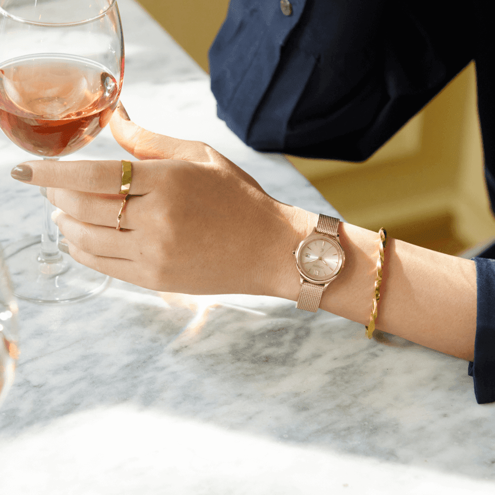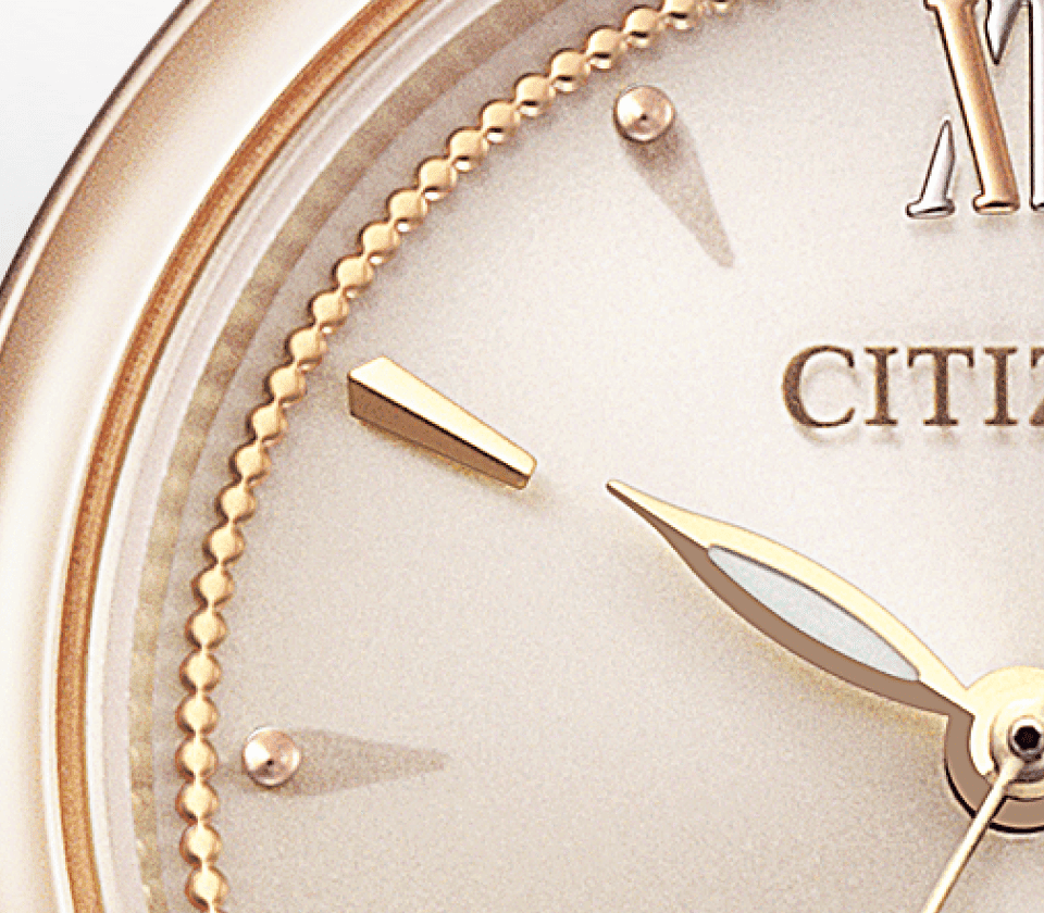 やさしく流れる水のようなケースラインと、雫のようにみずみずしく輝く小粒のミルグレインリング