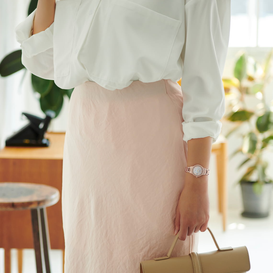 白蝶貝の文字板には、ピンクからブルーグレーに