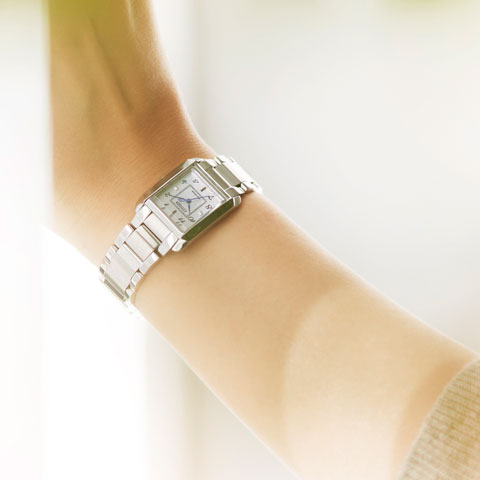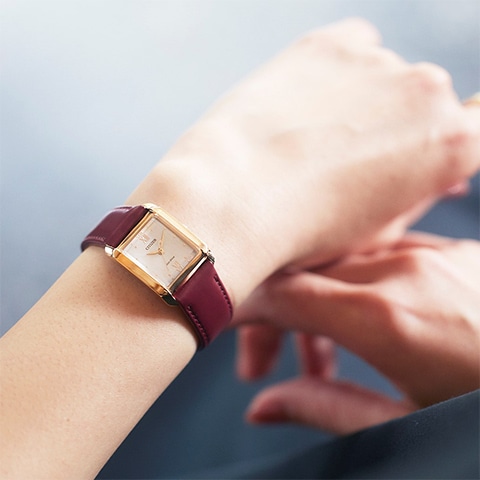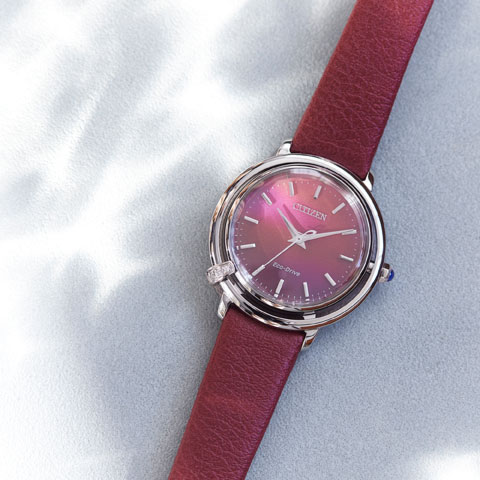 文字板は、シチズンの1960年代の時計からインスピレーションを得たデザイン。インデックスの上面には明るいブルーの差し色をあしらい、ドットのインデックスと相まって全体的に女性らしい印象に。