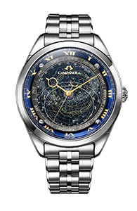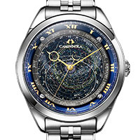 北緯35°で見える恒星と星雲・星団を細部に至るまで精密にレイアウトし、時刻に合わせてリアルタイムの星座を正確に表現する「星座盤モデル」(AO4010-51M)は、グラデーションが美しい紫がかったロイヤルブルーの見返しリングに、針やローマンインデックスのゴールドカラーが映える華やかなモデルです。