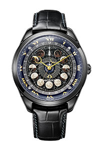 月の満ち欠けや月齢だけでなく月と太陽の位置なども表示する「月齢盤モデル」(AA7804-10F)は、デュラテクトDLC※1を施したケースやワニ革バンドのブラックと月齢盤のウォームグレーに、見返しリングのロイヤルブルーと針やインデックスのゴールドカラーがシックなアクセントになっています。