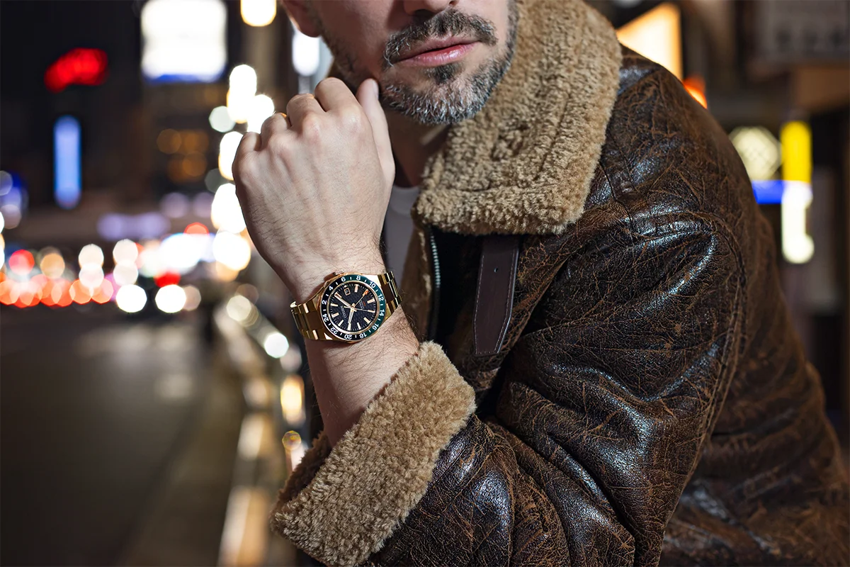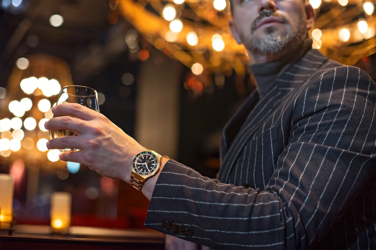 日本の組木にインスピレーションを受けたケースデザインと第3のタイムゾーンを表示できる両回転ベゼルが、スポーティに腕元を演出する。 -