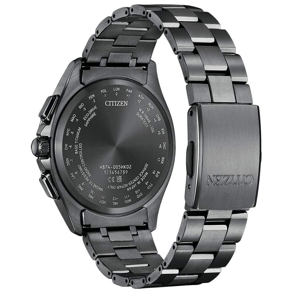 チタニウムにデュラテクト(表面硬化技術)を施したシチズン独自の素材『スーパーチタニウム』。ステンレスに比べて40%軽く、5倍以上の表面硬度を実現しています。