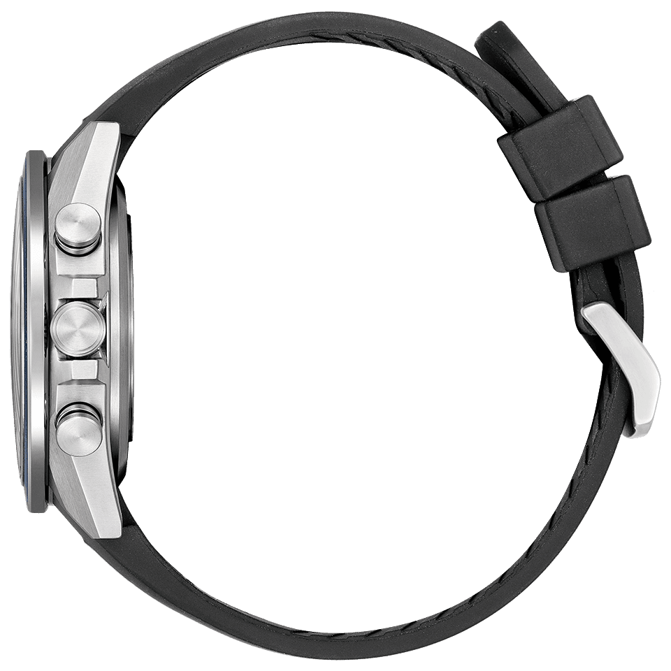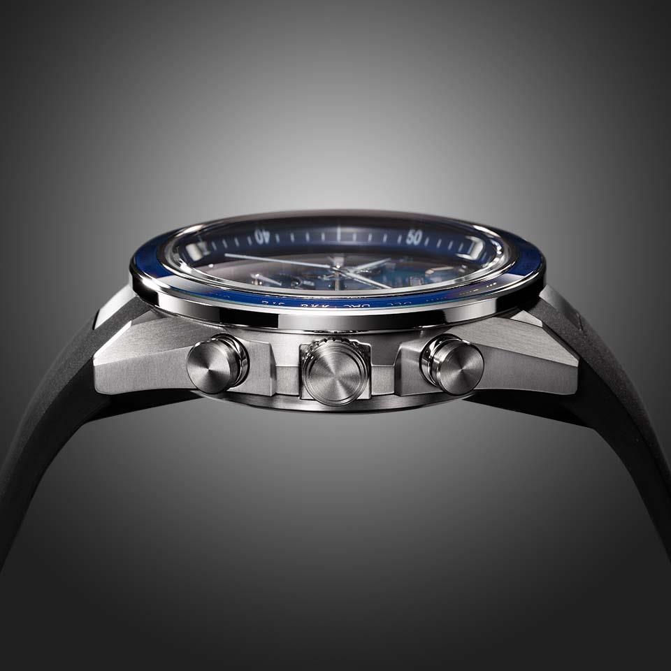 シックな印象を与えるブルーのサファイアベゼル。シルバー、ブラック、ブルーを使い分けたケースと文字板が、精悍な印象に仕上げています。腕にフィットしやすいウレタンバンドは、このモデルのために開発した仕様です。