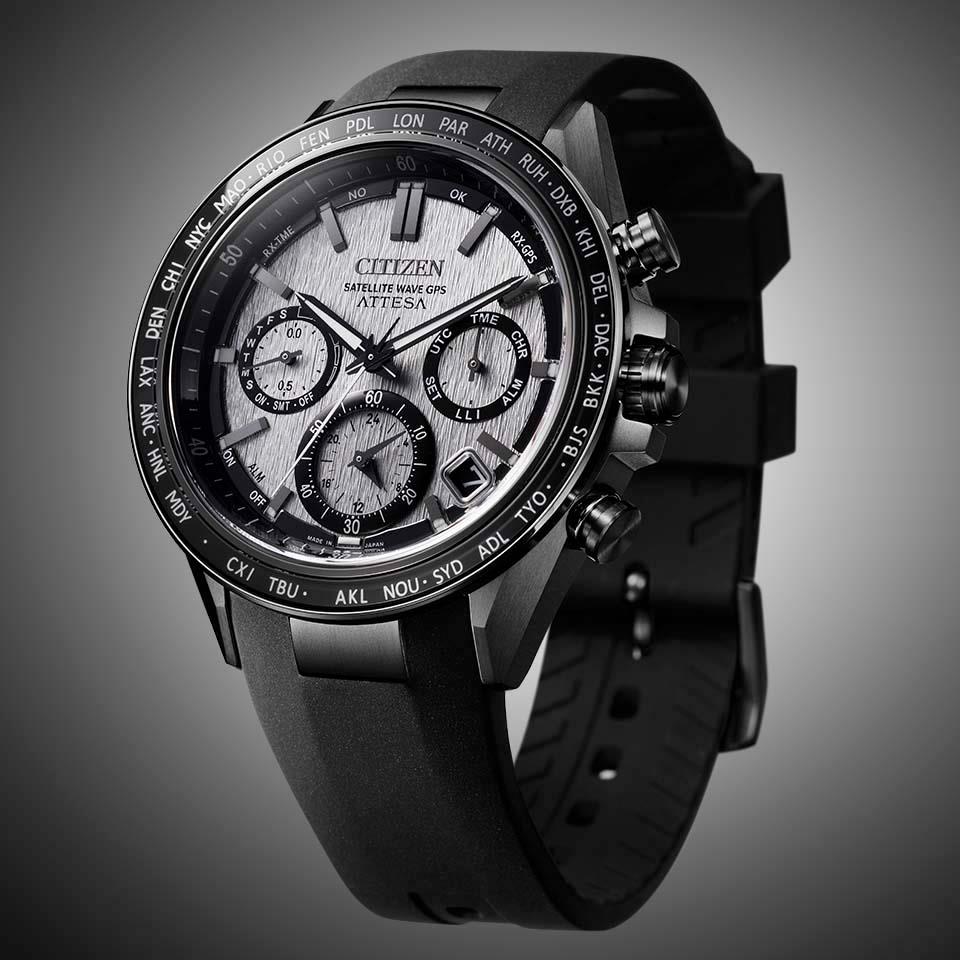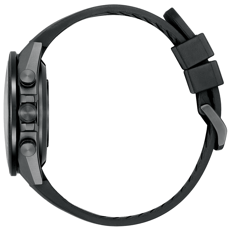 ブラックとシルバーで全体をまとめながら、それぞれのパーツの質感や輝きがクールでラグジュアリーなオーラを放つ1本。バンドは、装着感の良いウレタン素材を採用しています。