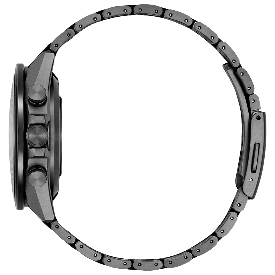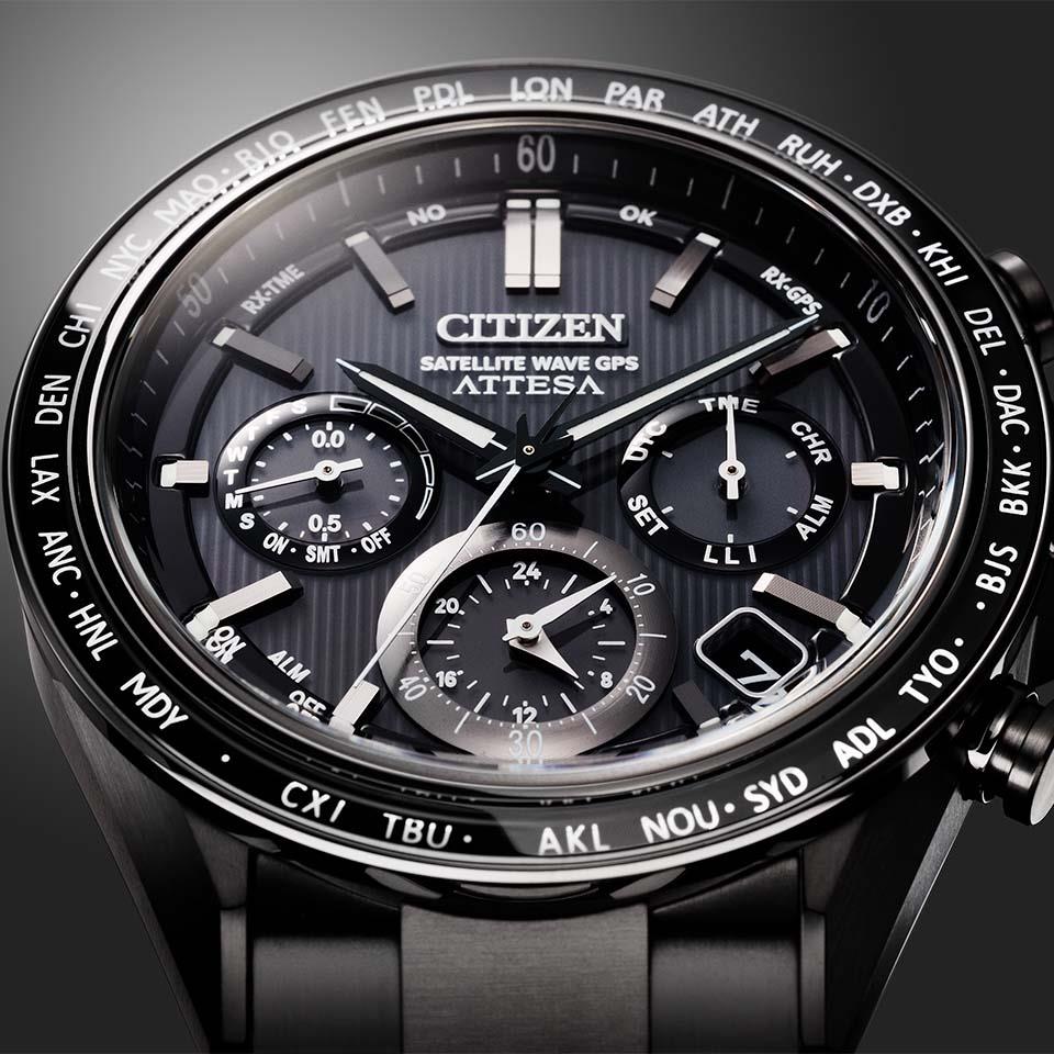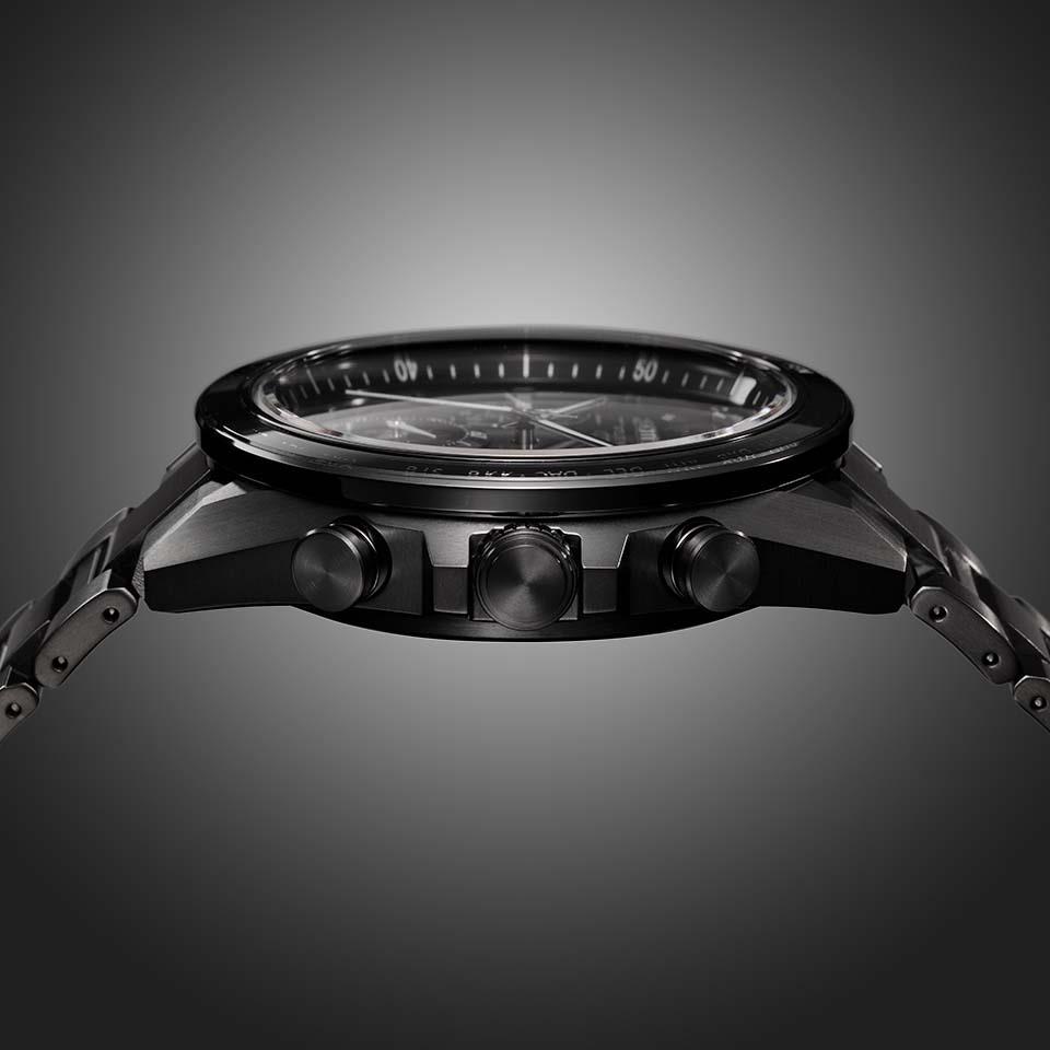 光沢のあるブラックのサファイアベゼルが、ワントーンで統一されたクールな文字板をまとめ上げています。文字板を構成する各パーツには、質感や色味が異なるブラックを使い、主張を感じる力強いフェイスに仕上げています。