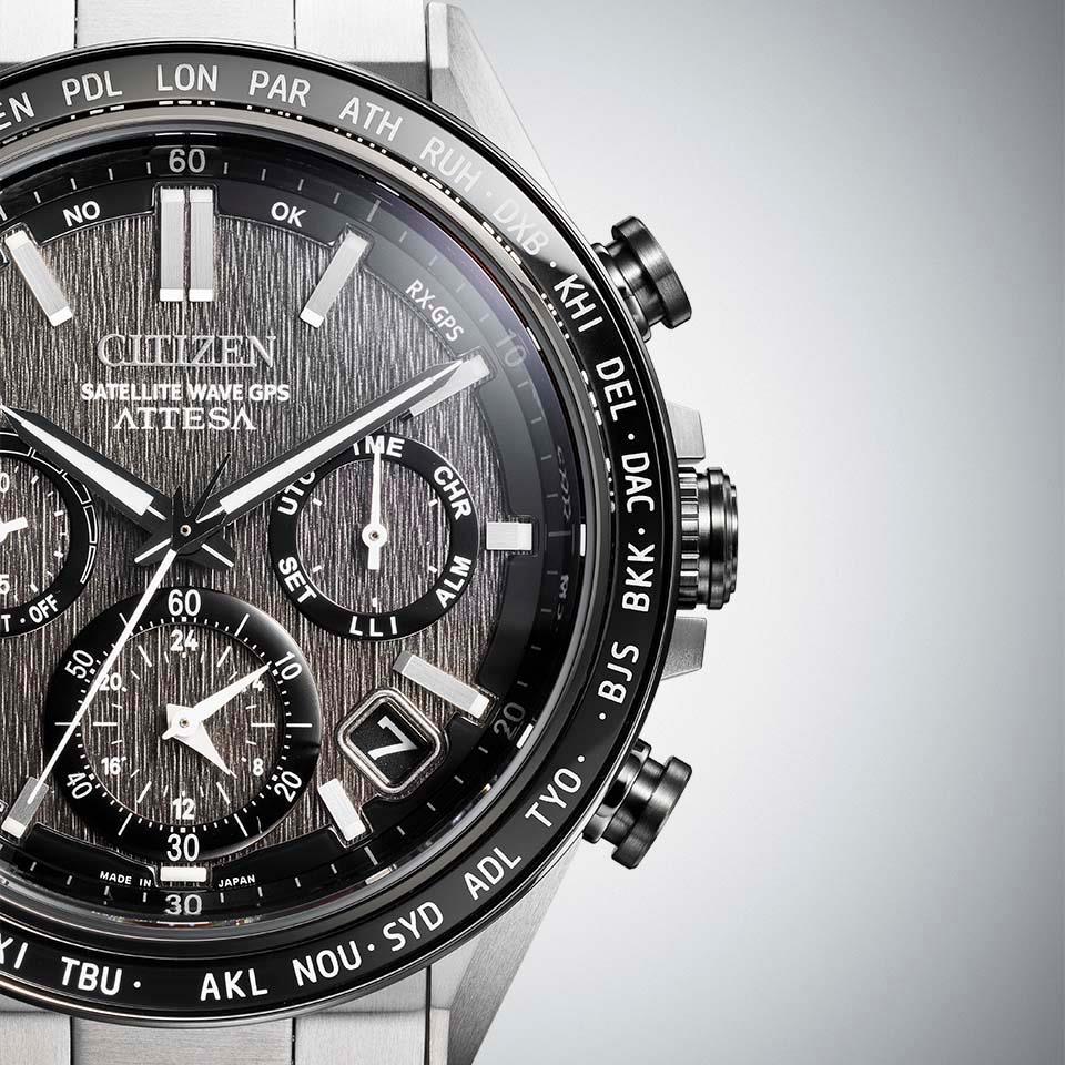 文字板にはヘアライン状のパターンとメタリック塗装を施し、金属のような質感を表現しました。ベゼルには、艶やかな光沢を放つサファイアガラスを採用。シルバー蒸着で閉じ込められた都市名が手元を彩ります。ケースとバンドはシルバー。ベゼル、プッシュボタン、りゅうずはブラックでデザイン。シルバーとブラックのコントラストが、スポーティな印象を際立たせ、大人の個性が感じられる1本です。