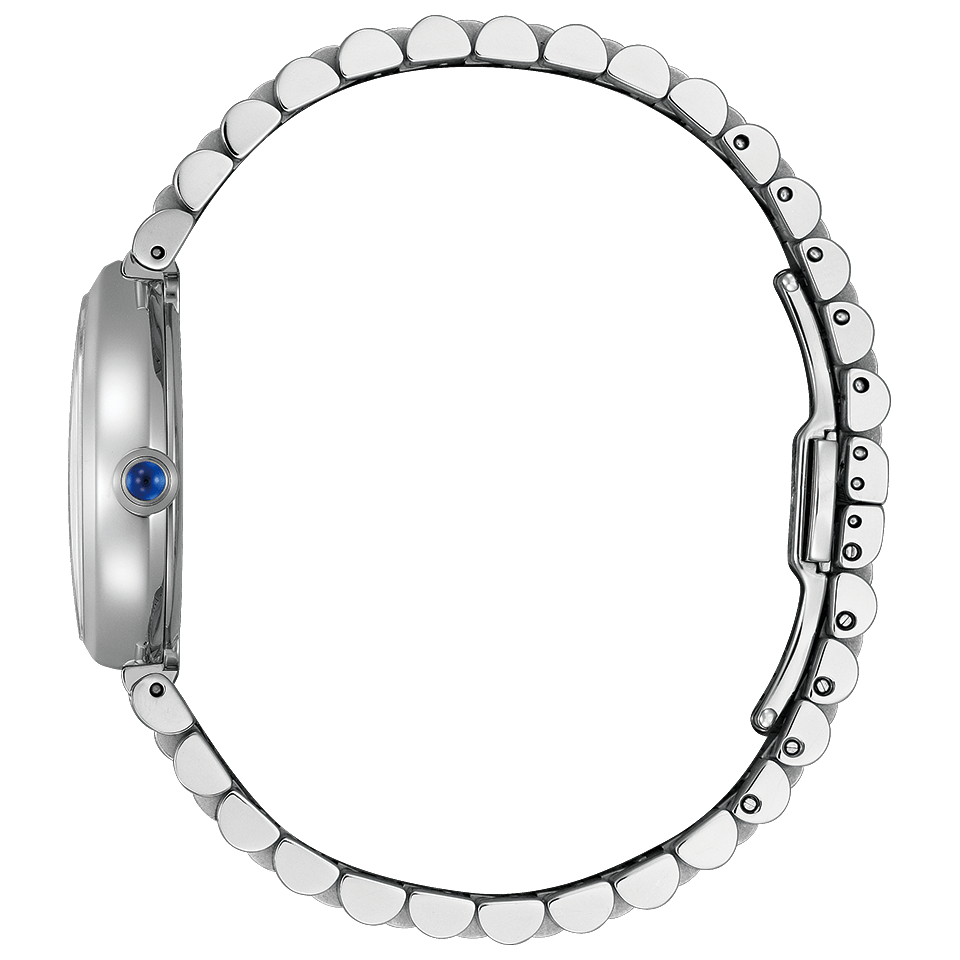 「Rain(雨)」と「Bella(美しい)」を組み合わせて名付けられた“RAINELL”(レイネル)。地球を潤し、世界を映しながら光を反射する雨の雫にインスピレーションを得たジュエリーライクなコレクションです。優雅な曲線を持つドロップ形状を印象付けるかのように、腕の動きでリズミカルな輝きを演出するボリュームある3列バンドを採用。彫刻的なフォルムは、立体感と陰影が美しく際立ち、どの角度から見ても洗練された存在感を放ちます。文字板には、霧雨を思わせるヘアラインパターンを施し、クラシカルで落ち着いたバランスのインデックスを配置、上品な印象に仕上げました。