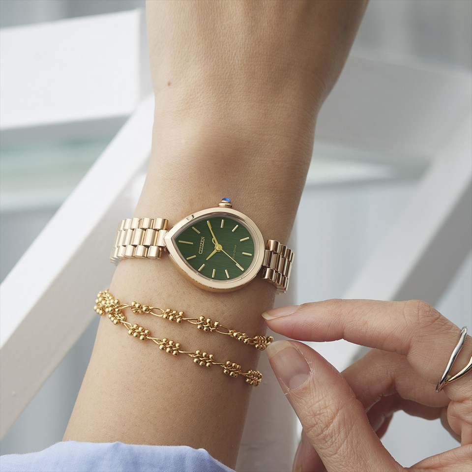 「Rain(雨)」と「Bella(美しい)」を組み合わせて名付けられた“RAINELL”(レイネル)。地球を潤し、世界を映しながら光を反射する雨の雫にインスピレーションを得たジュエリーライクなコレクションです。優雅な曲線を持つドロップ形状を印象付けるかのように、腕の動きでリズミカルな輝きを演出するボリュームある3列バンドを採用。彫刻的なフォルムは、立体感と陰影が美しく際立ち、どの角度から見ても洗練された存在感を放ちます。文字板には、霧雨を思わせるヘアラインパターンを施し、クラシカルで落ち着いたバランスのインデックスを配置、上品な印象に仕上げました。