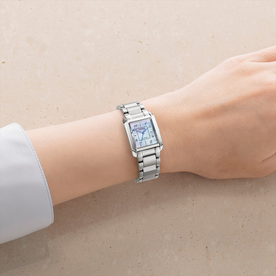 やや丸みをおびたスクエアケースと大胆にカットされたサファイアカーブガラス、白蝶貝の文字板がタイムレスでエレガントなデザインを表現したモデル。文字板にはアラビア数字のインデックスを採用。サファイアカーブガラスのカット位置を調節して映り込みを減らし、視認性が向上しました。