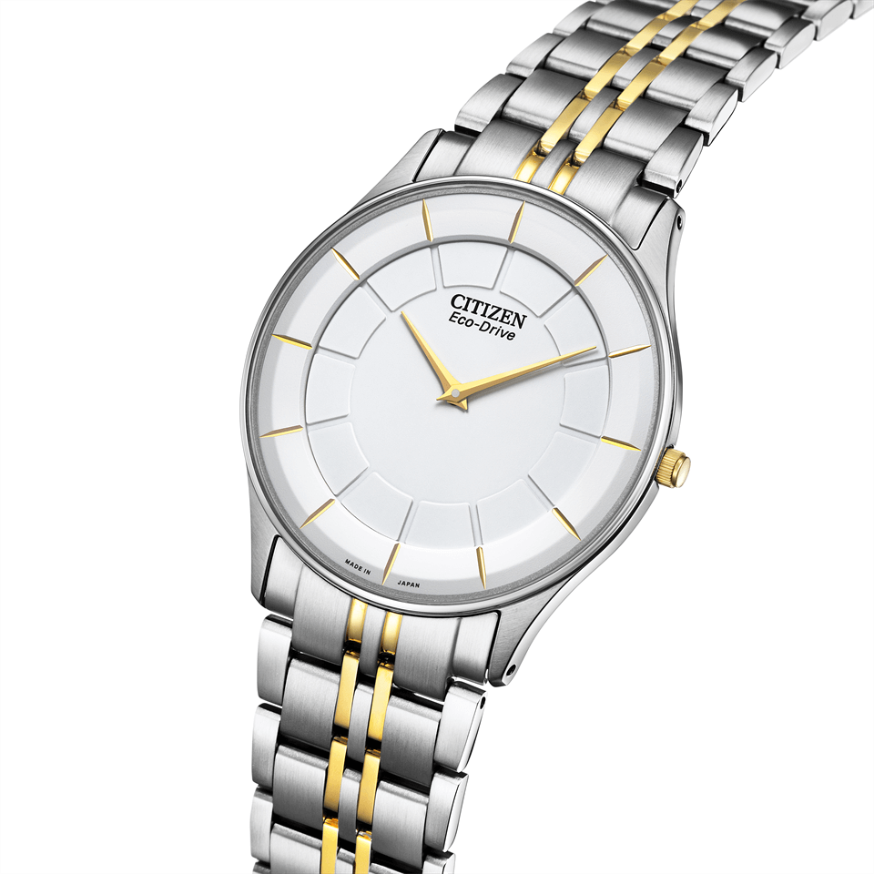光発電『エコ・ドライブ』は、太陽光や室内のわずかな光を電気に換え、時計を動かしつづけるシチズン独自の技術です。一度フル充電すれば、光のないところでも長時間動き続けるので、定期的な電池交換は必要ありません。