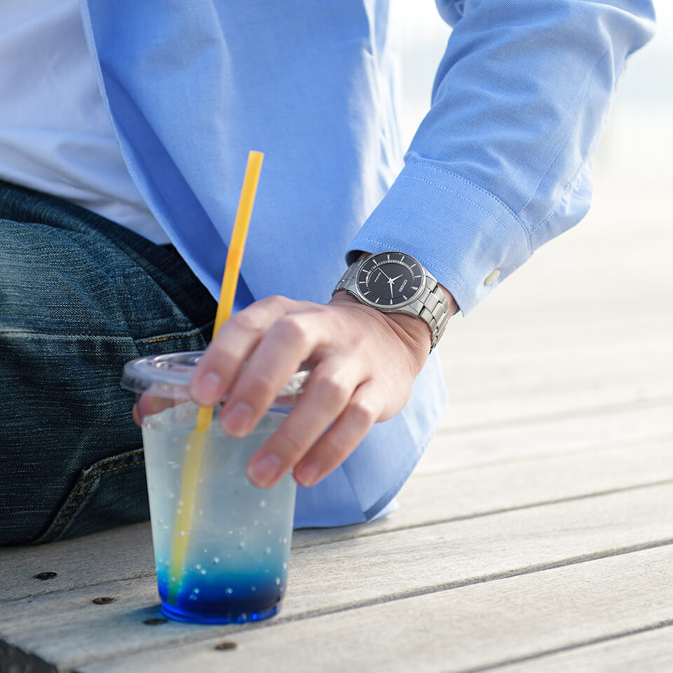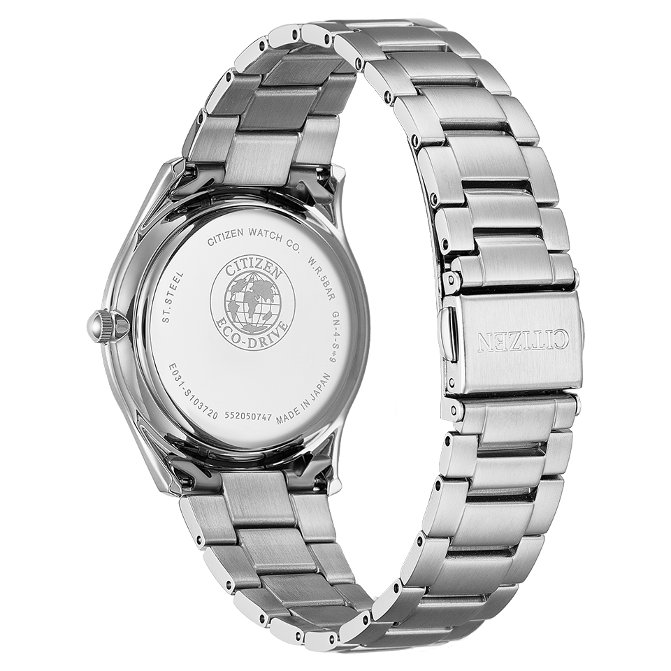 光発電『エコ・ドライブ』は、太陽光や室内のわずかな光を電気に換え、時計を動かしつづけるシチズン独自の技術です。一度フル充電すれば、光のないところでも長時間動き続けるので、定期的な電池交換は必要ありません。