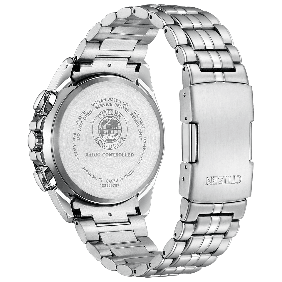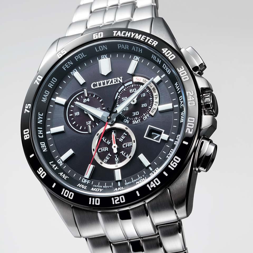 世界の時差を表示するワールドタイム機能を搭載した、エコ・ドライブ電波時計クロノグラフモデル。クロノグラフ、日付表示などを搭載した高機能モデルです。ビジネスからカジュアルシーンまで、様々なシーンに調和するデザインです。