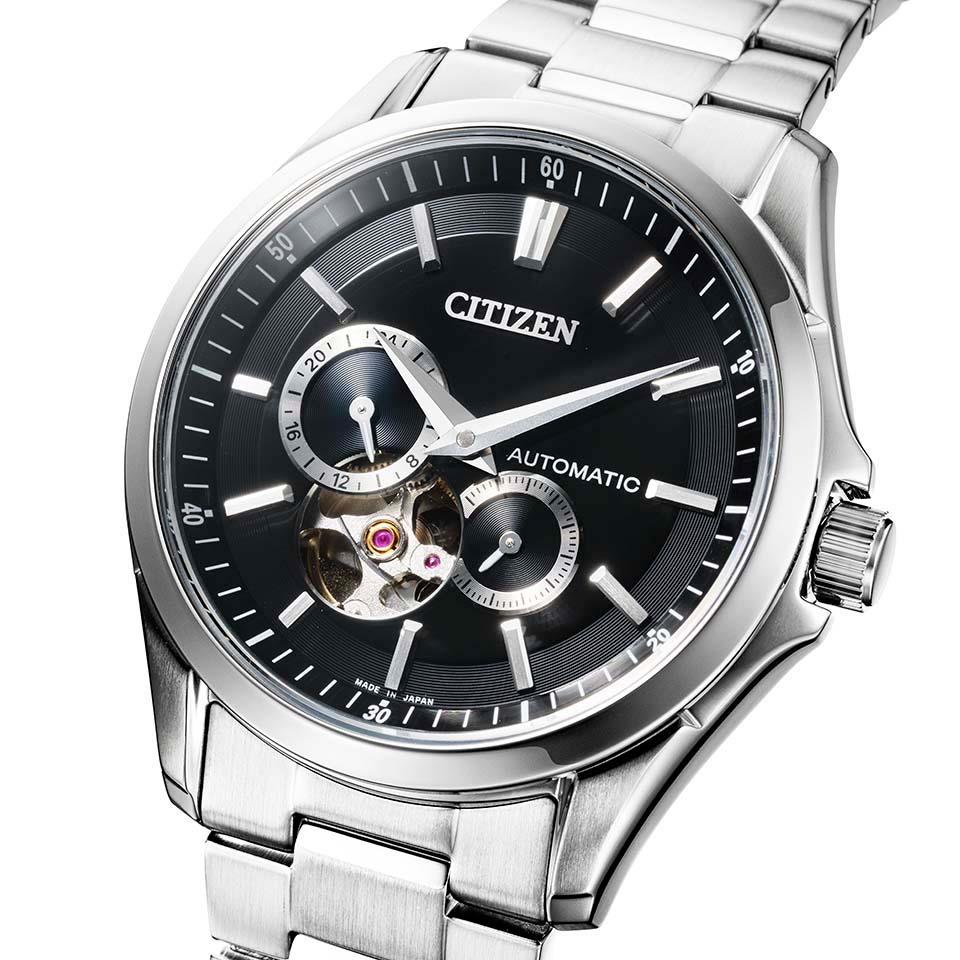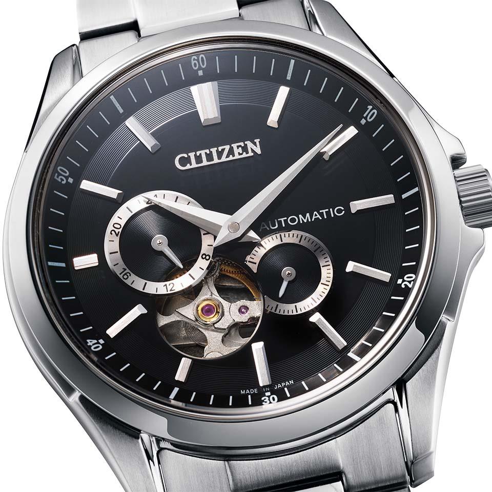 秒停止機能を搭載したキャリバーを搭載。2つの別体リングを組み合わせた立体感、重厚感のあるデザイン。60秒針仕様のサブダイヤルなど、こだわりの機能を搭載しています。文字板7時の位置から、メカニカルウオッチの心臓部であるテンプの繊細な動きを堪能できるオープンハート仕様で、裏ぶたは回転する錘(おもり)部分とメカの動きを楽しめるシースルーバック。ご自身で、簡単にバンドのサイズが調整できるシンプルアジャスト仕様です。