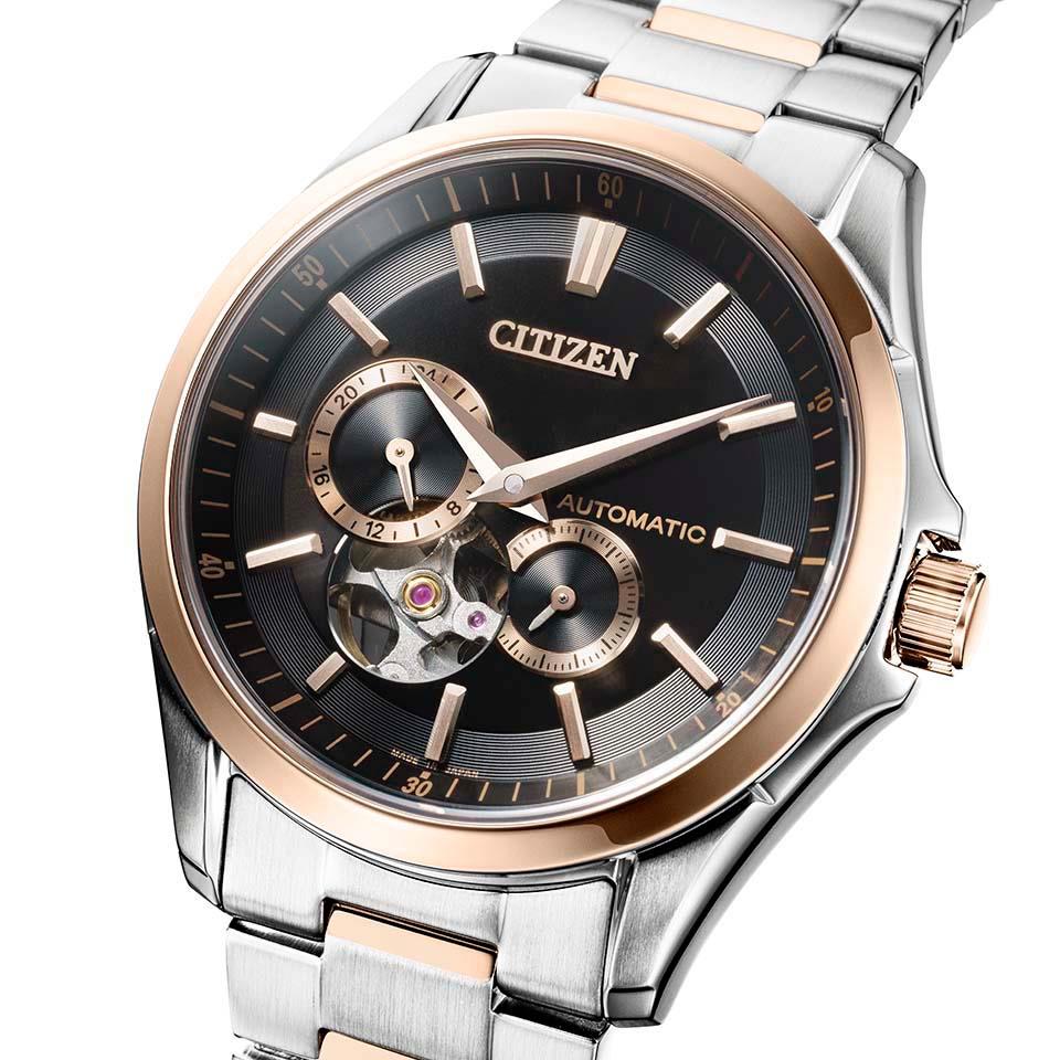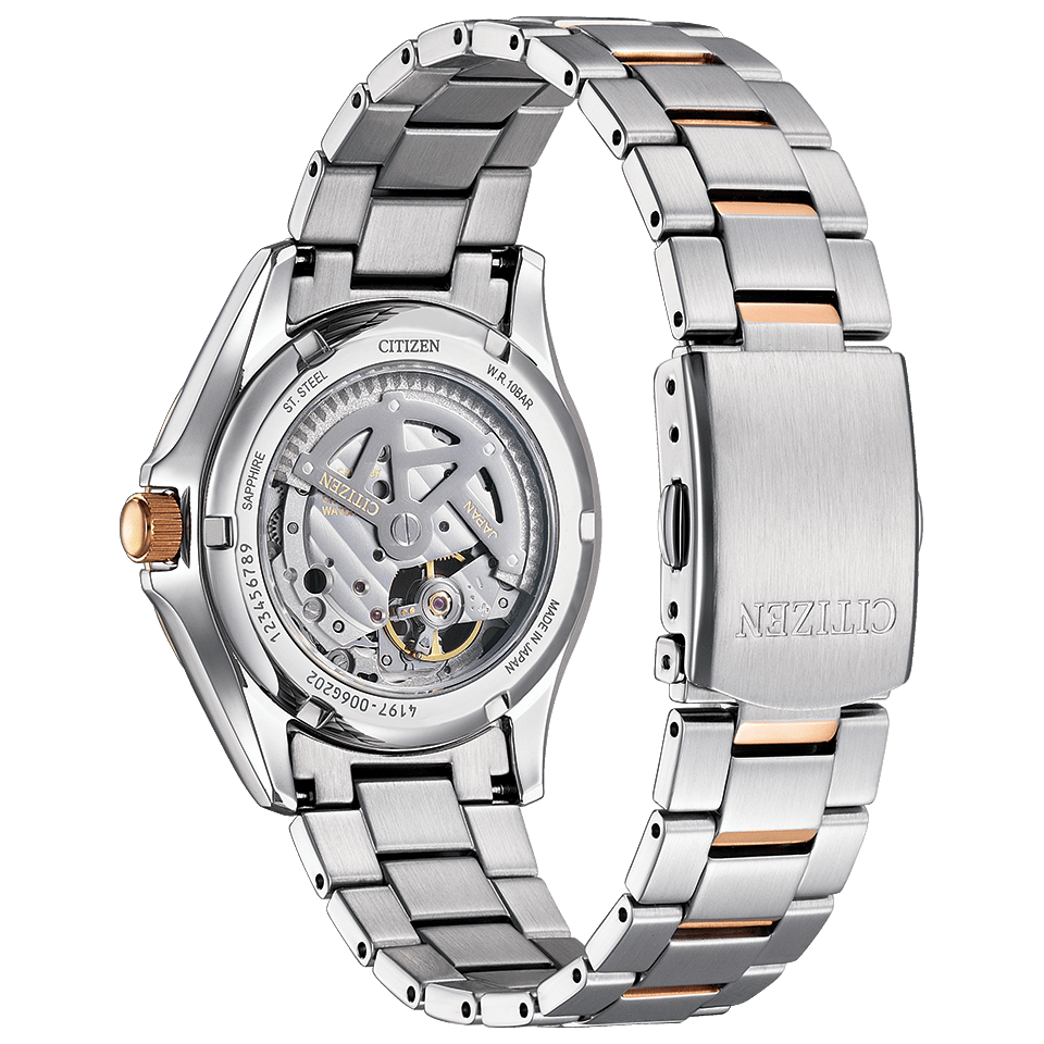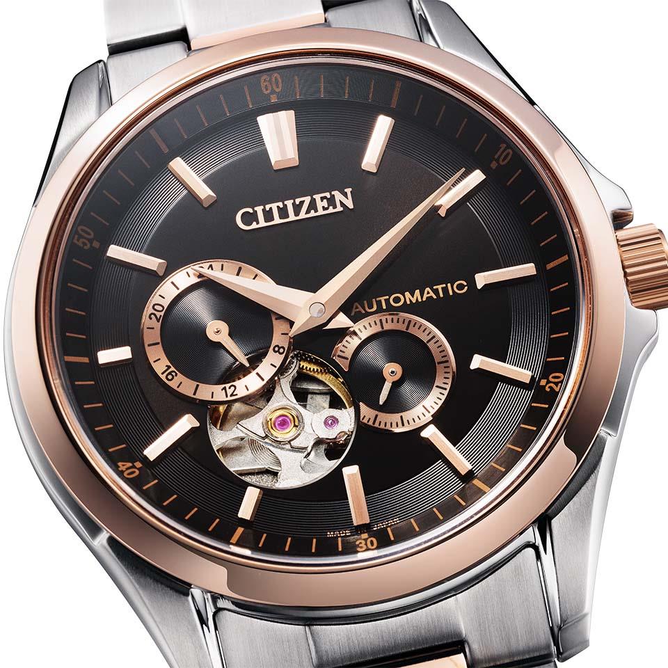 秒停止機能を搭載したキャリバーを搭載。2つの別体リングを組み合わせた立体感、重厚感のあるデザイン。60秒針仕様のサブダイヤルなど、こだわりの機能を搭載しています。文字板7時の位置から、メカニカルウオッチの心臓部であるテンプの繊細な動きを堪能できるオープンハート仕様で、裏ぶたは回転する錘(おもり)部分とメカの動きを楽しめるシースルーバック。ご自身で、簡単にバンドのサイズが調整できるシンプルアジャスト仕様です。