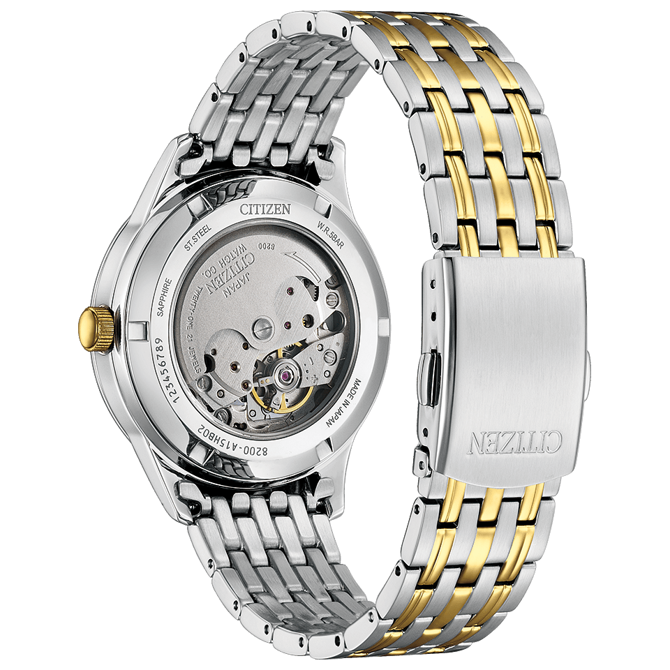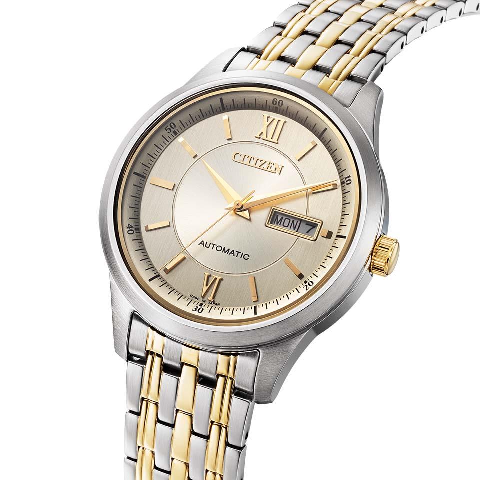 すっきりとしたシンプルでクセのない文字板のデザインで、デイ&デイト表示があり、視認性にも優れています。バンドは、シルバーとイエローゴールドを組み合わせた人気のツートンカラーを採用。時刻を合わせる際、りゅうずを引き出すと秒針が止まる「秒針停止機能」を搭載しています。