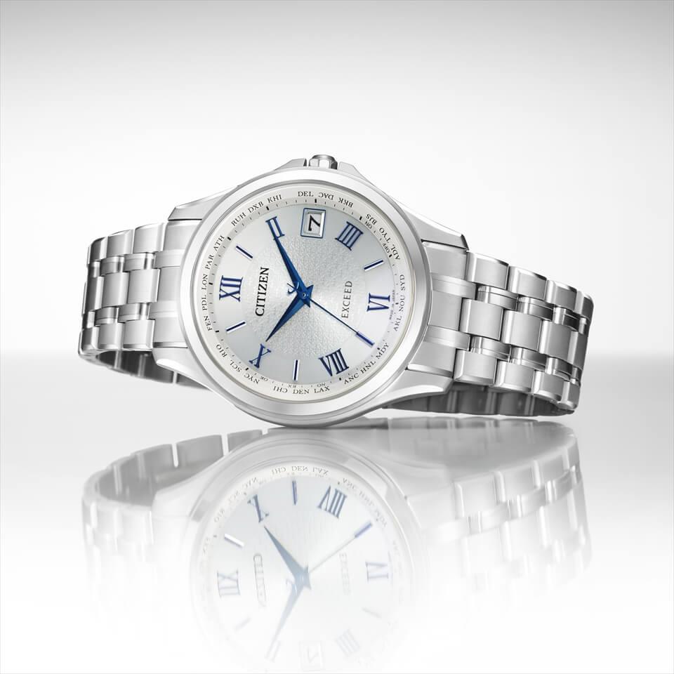 明るく透き通るような色調のデュラテクトプラチナのケースに、差し色のブルーの針がアクセントに。レディスモデルとのペアウオッチにもおすすめです。