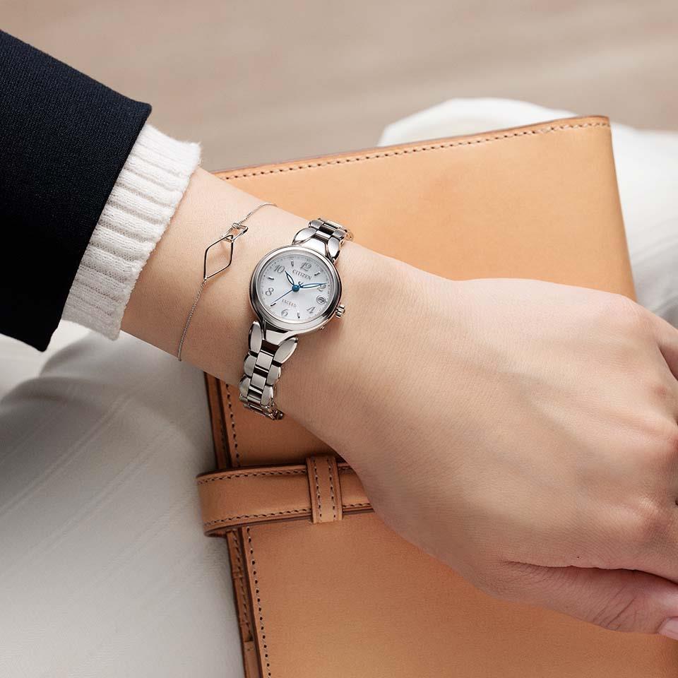 明るく透き通るような色調のデュラテクトプラチナのケースに、差し色のブルーの針が腕元を華やかに彩ります。