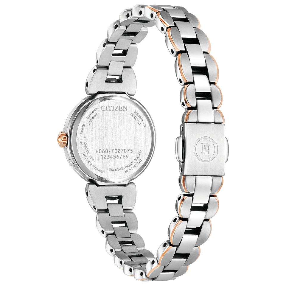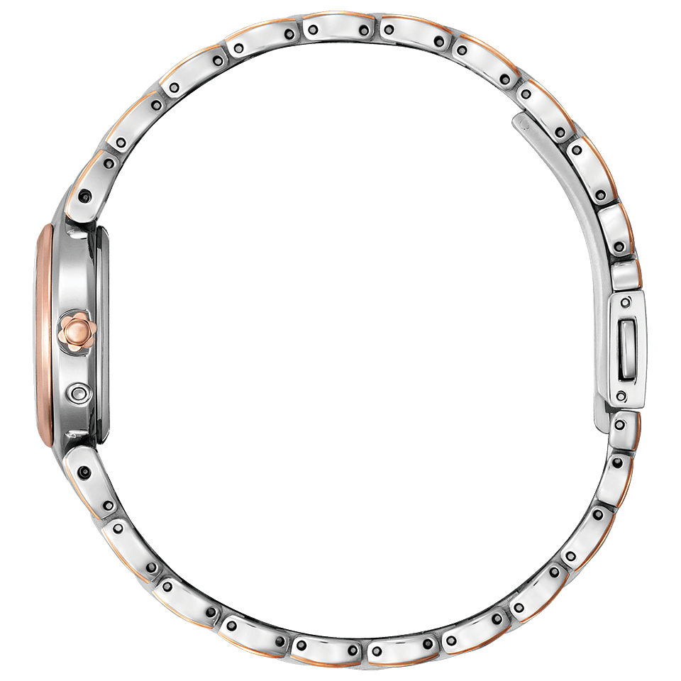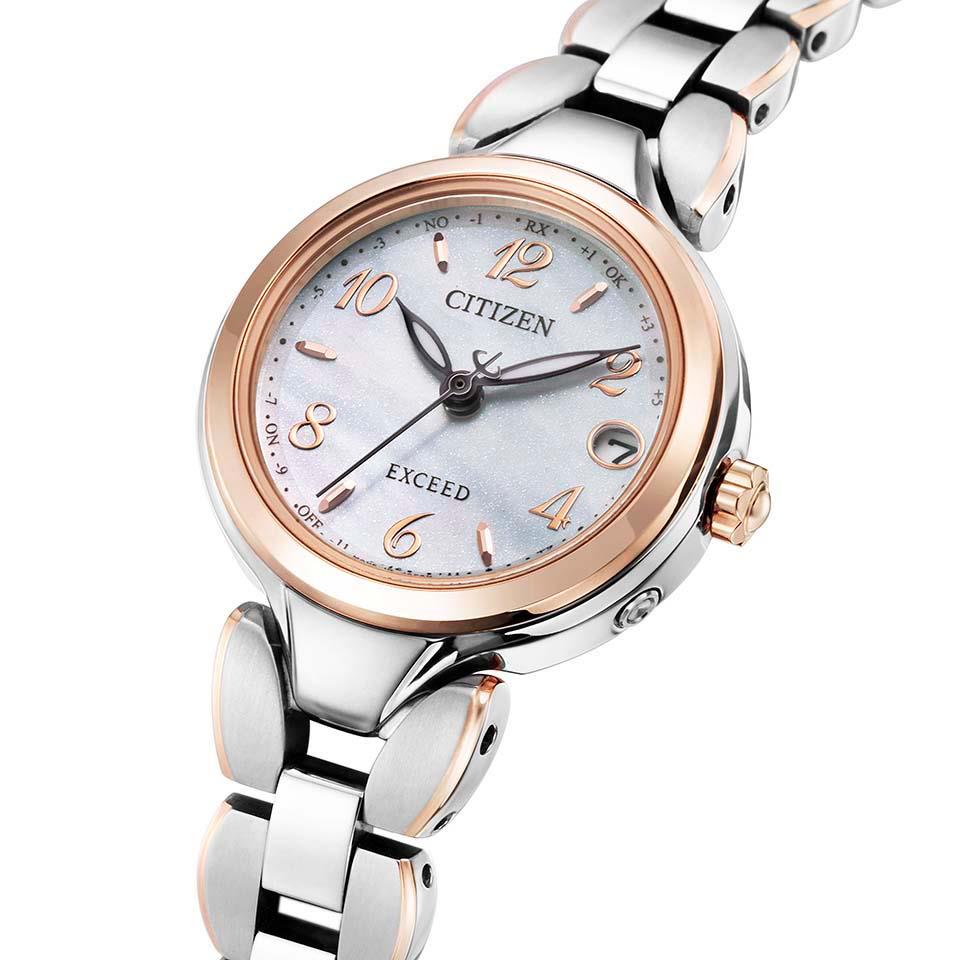 白蝶貝の文字板に、ライトシルバー×ピンクゴールドのケースが腕元を明るく華やかに彩ります。