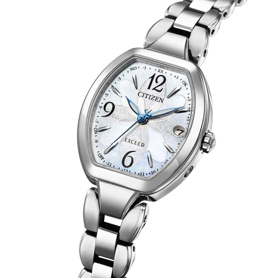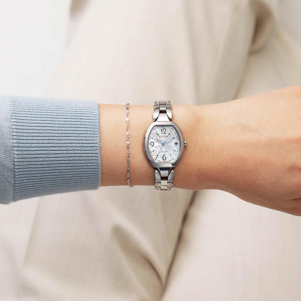 明るく透き通るような色調のデュラテクトプラチナのケースに、差し色のブルーの針が腕元を明るく華やかに彩ります。