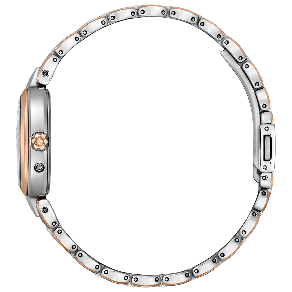 人気のあるお花をモチーフにしたバンドに、ピンクゴールドのベゼルを合わせたツートン仕様。柔らかく広がる光をデザインに込め、新しいときを感じる表情に仕上げました。文字板にはシルバーのラメを練り込み、中央から光が広がるような放射パターンを組み合わせ、華やかさと奥行きのある幻想的なデザインに。放射パターンに沿って、11ポイントのダイヤモンドをあしらった限定モデルです。