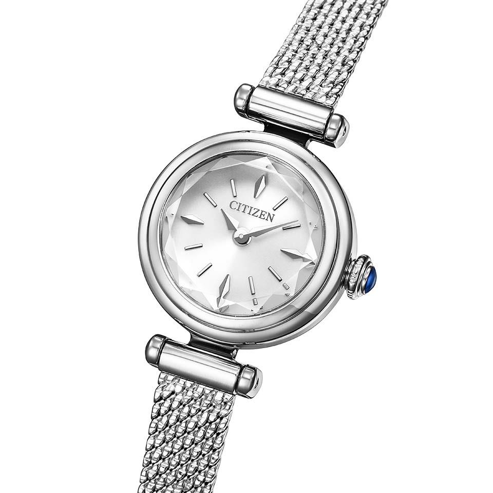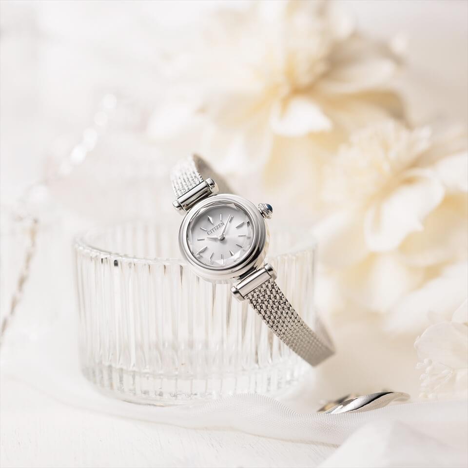 ころんとした形に、華奢な佇まいが魅力のラウンドケース。飾りピンに見立てたパーツやメッシュバンドが、シックでアンティークなジュエリーのような表情を演出。ガラス製のアクセサリーボックスをイメージしたカットガラスが繊細に輝きます。りゅうずにはケースに合わせたアクセントカラーをプラスし、さりげないおしゃれを楽しめます。