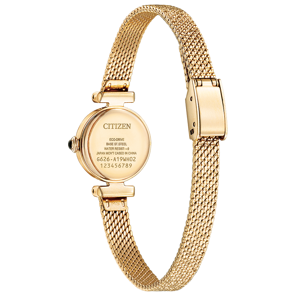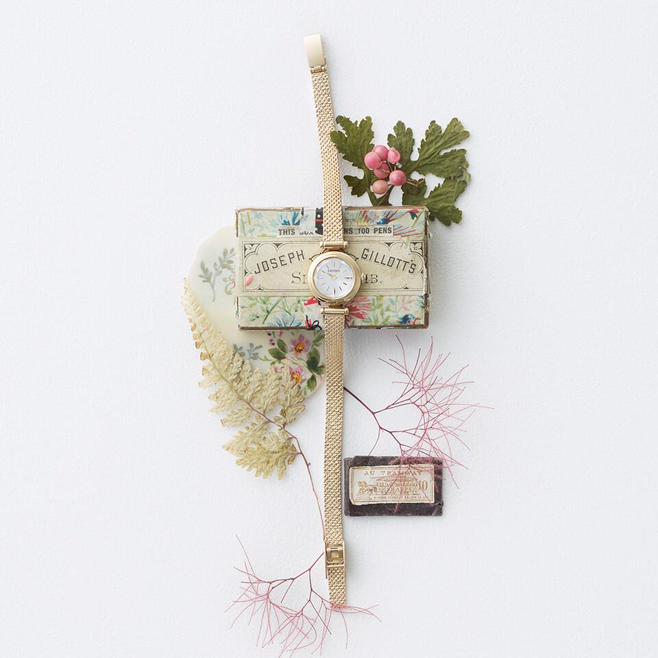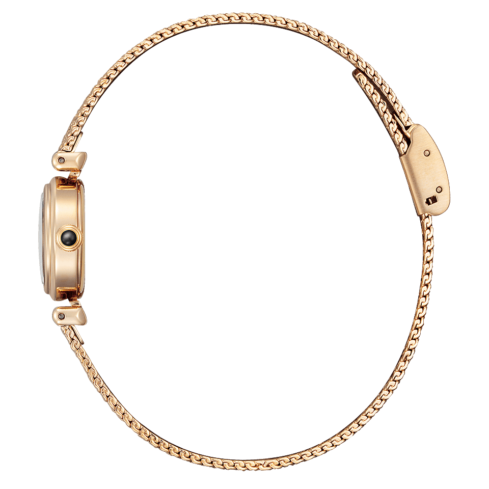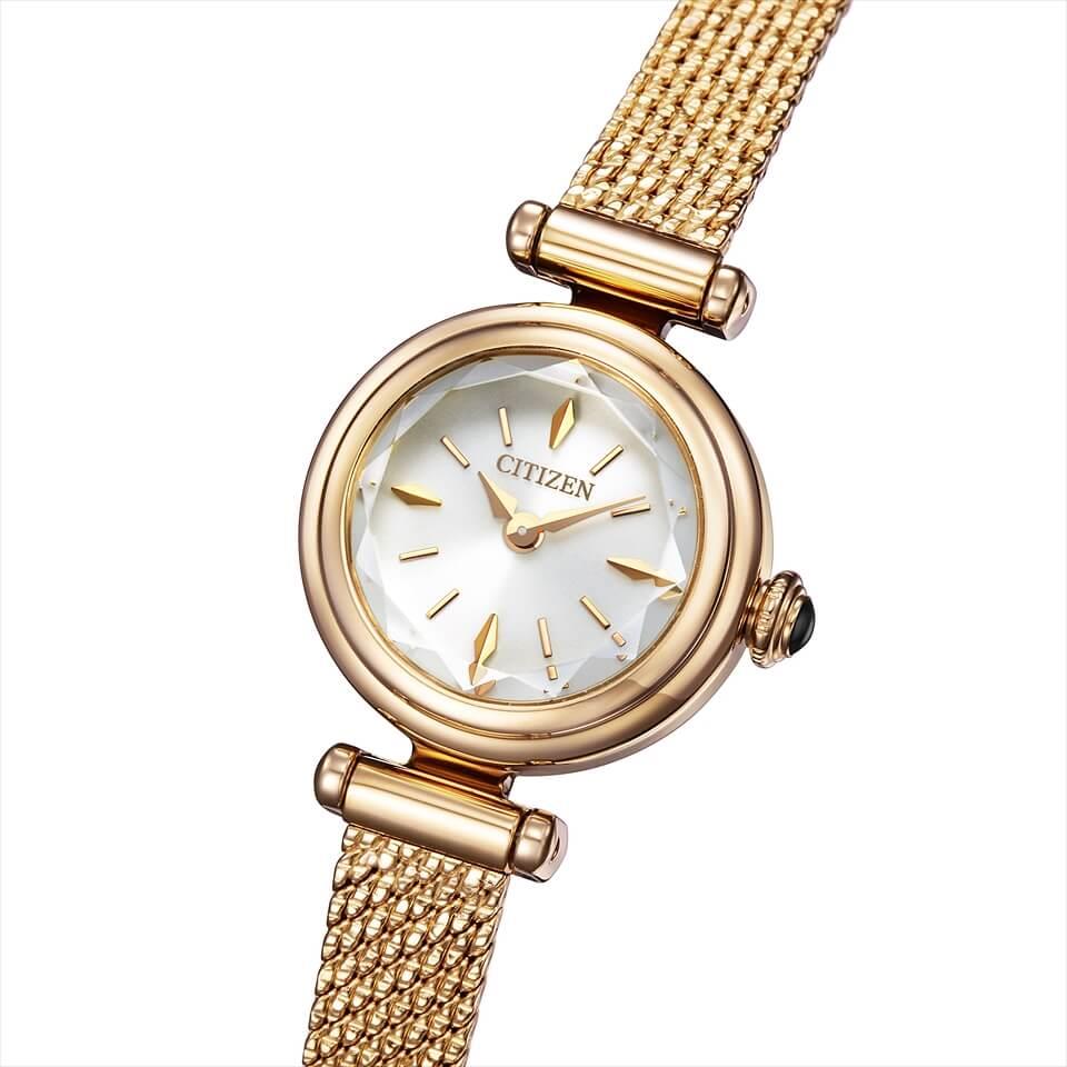 ころんとした形に、華奢な佇まいが魅力のラウンドケース。飾りピンに見立てたパーツやメッシュバンドが、シックでアンティークなジュエリーのような表情を演出。ガラス製のアクセサリーボックスをイメージしたカットガラスが繊細に輝きます。りゅうずにはケースに合わせたアクセントカラーをプラスし、さりげないおしゃれを楽しめます。