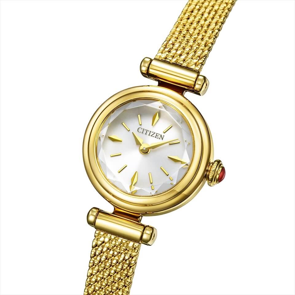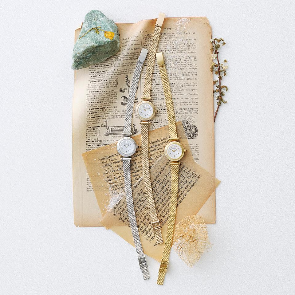 ころんとした形に、華奢な佇まいが魅力のラウンドケース。飾りピンに見立てたパーツやメッシュバンドが、シックでアンティークなジュエリーのような表情を演出。ガラス製のアクセサリーボックスをイメージしたカットガラスが繊細に輝きます。りゅうずにはケースに合わせたアクセントカラーをプラスし、さりげないおしゃれを楽しめます。