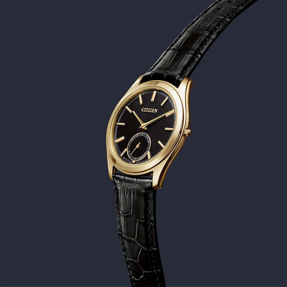 シチズン独自の表面硬化技術デュラテクトの新色、落ち着いたイエローゴールド色「アンバーイエロー」のケースに艶やかなブラックの文字板。無駄を削ぎ落した薄型フォルムとの調和を追求し、6時位置に配したスモールセコンドはインデックスを短くするなど、ミニマルな要素でまとめています。