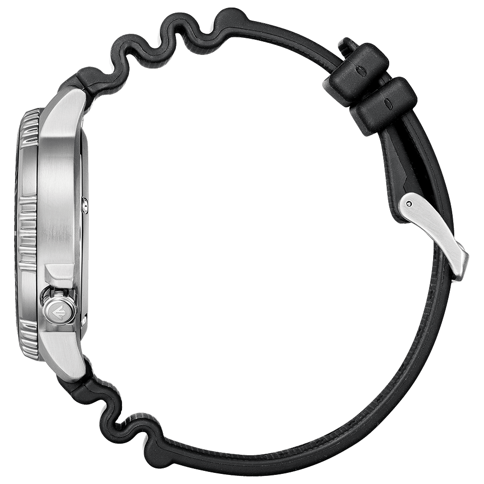 水中や暗い場所でも表示が見やすい夜光仕上げの針とインデックス、誤作動を防ぐ逆回転防止ベゼル、ねじロックりゅうずなど、ダイビング中の安全性を考慮した本格機能を搭載しています。腕への装着性を考慮し、手首に干渉しづらい4時位置にりゅうずを配置。カレンダーも4時位置に配置することで12・3・6・9時の重要なポイントの視認性を高めています。ISO規格*をクリア。