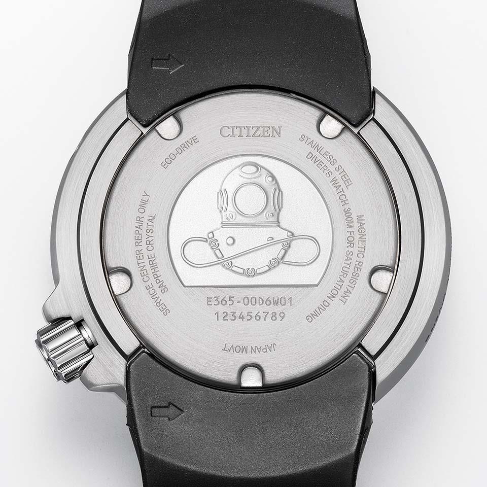 ケースの2時側に、時計の破損を防ぎ、ダイバーを守る機構「ヘリウムエスケープバルブ」を設置した300m飽和潜水用防水モデル。Cal.E365を搭載し、光が届かない深海の環境下でもフル充電から約1年間駆動し続けます。艶感のある文字板は、深海をイメージしたグラデーションをうっすらと施し、シンプルでありながらも重厚で力強い印象に仕上げています。立体感と迫力が際立つステンレス製の逆回転防止ベゼルは、操作が容易な120クリック仕様。ウレタンバンドには、ひび割れや破損が起こりにくく、環境に配慮した樹脂素材「BENEBiOL™」を配合しました。飽和潜水モデルの証として、裏ぶたに潜水用ヘルメットの柄、ケースの9時側には「300m PROFESSIONAL DIVER'S」の文字が刻印されています。