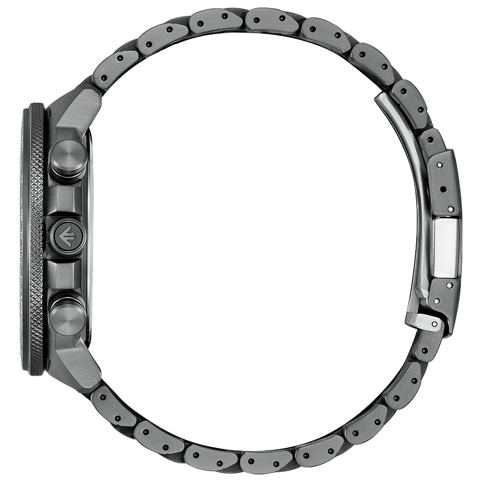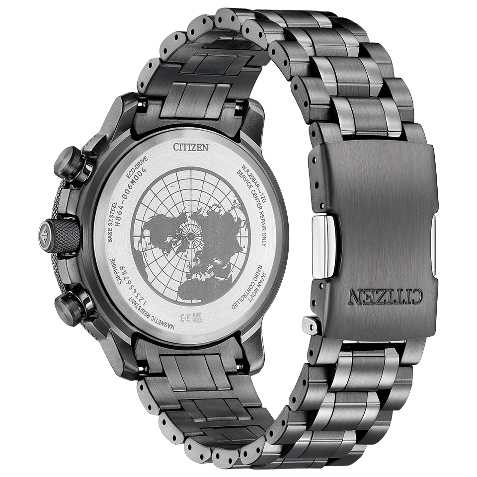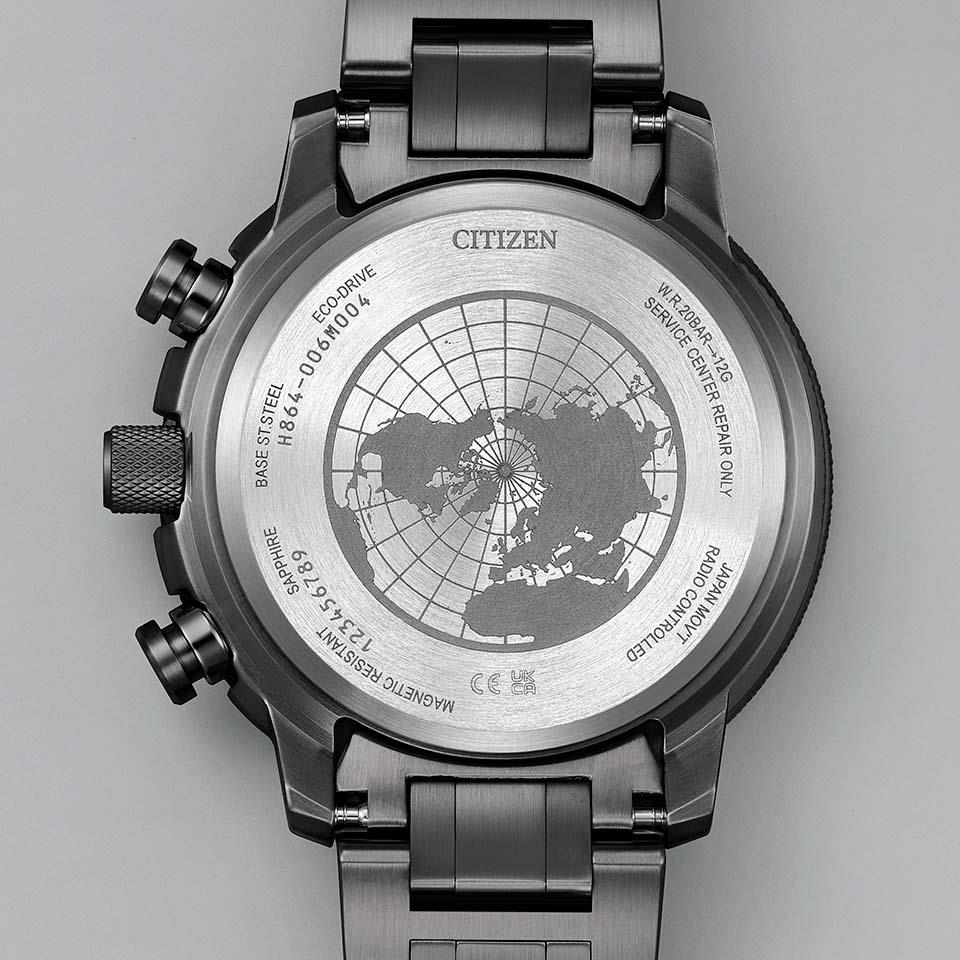 6時側のサブダイヤルにUTC時刻を表示するUTC円板針を採用したユニークなモデルです。6時位置のリングの数字と合わせると、北半球にある都市の大まかな時刻を読み取ることができます。UTC円板針は一日かけてゆっくり一周します。各都市表記や円板部の数字などには古地図や航空図でよく見られるフォントを採用し、世界の開拓が進んだ1600年代の知的なニュアンスを持たせています。あえて航空計算尺部分とは異なるフォントを活用することで、判読性も追求しました。視認性を向上するために拡大したダイヤルとベゼルに対して、ケースをすり鉢状にすることで重さを軽減しつつ、薄さも強調しました。ヘアラインを生かしてマットに仕上げながら、ベゼルの斜面やプッシュボタンガードなどにはミラー加工をあしらった、メリハリを利かせたデザインです。裏ぶたには北半球の地図が刻印されています。