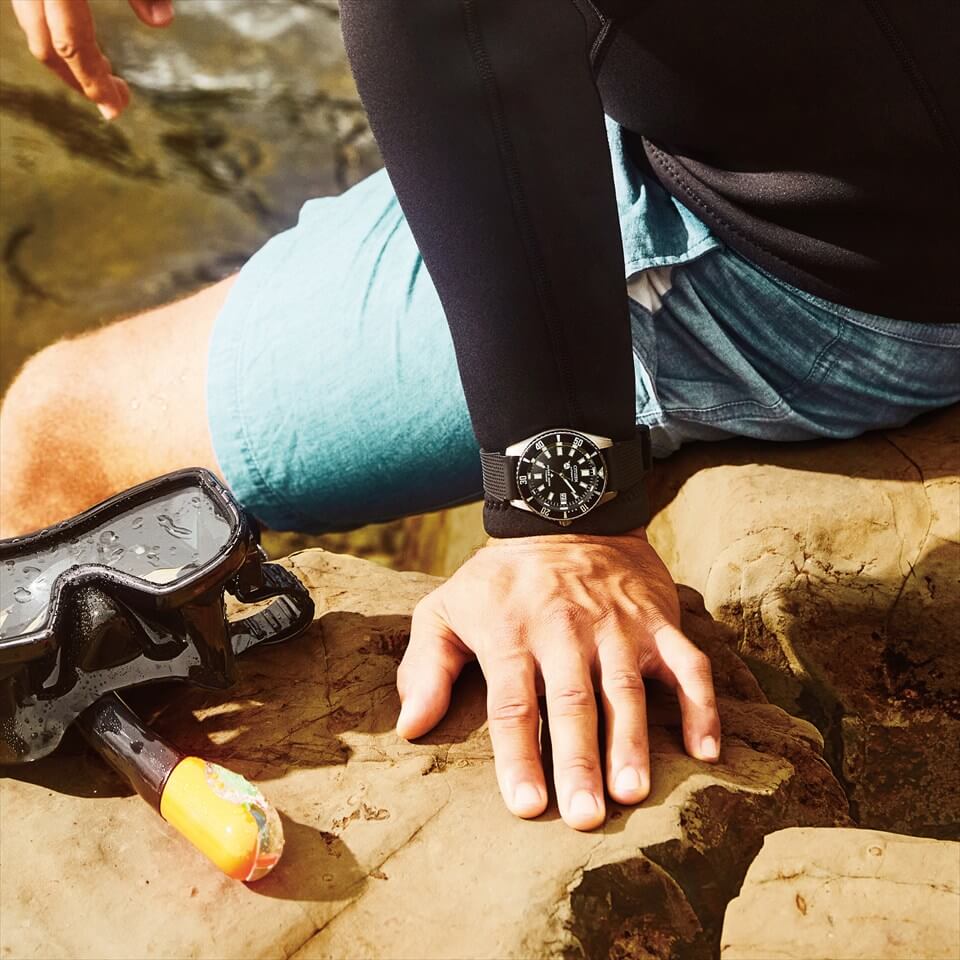 Go Deeperどれだけ潜っても届くことのない深い海の底へ。本格仕様のダイバーズウオッチ。プロマスター「MARINEシリーズ」。1977年発売の「チャレンジダイバー」のデザインを継承し、現代的にアップデートした強化耐磁仕様ムーブメント搭載のメカニカルダイバーズウオッチが登場。海に落ちてフジツボに覆われながらも動き続けていたことから「フジツボダイバー」として愛された、機械式ダイバーズウオッチ「チャレンジダイバー」のデザインを継承。過去のレガシーを生かしながら、スペックや素材をアップデートしました。
