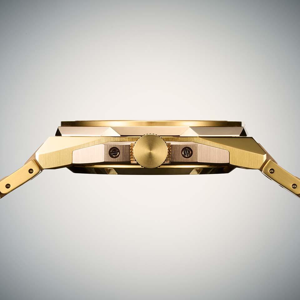 シリーズエイトの特長である別体構造を活かしつつ、ケース径・厚みを抑えることで腕なじみが良く、快適なフィット感になっています。5つのパーツで構成された薄型のケースは、それぞれのパーツを徹底的に磨き上げ、シャープでエッジの立ったデザインに仕上げました。文字板には、日本伝統の市松模様をイメージしたSeries 8のオリジナルパターンを中央セクター部分にのみデザイン。新たな形状のインデックスを採用しスタイリッシュな印象の中にもエレガントな雰囲気を漂わせました。