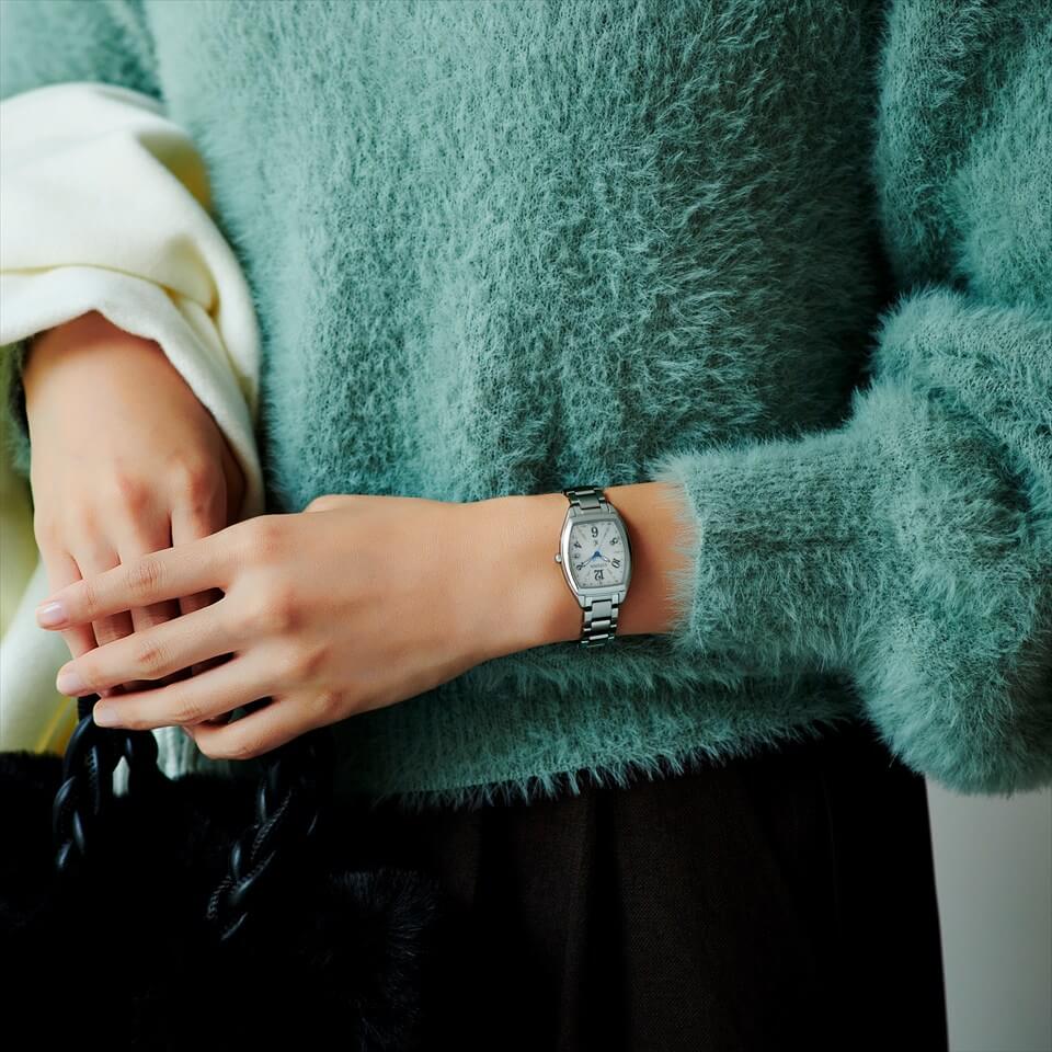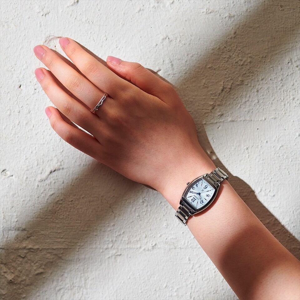 使いやすく見やすいながらも、ミニマルで女性らしいサイズのトノー型モデル。愛らしい丸みのあるアラビア数字は見やすさにもこだわったオリジナルフォント。文字板に施した4ポイントのカットパーツが腕元できらっと輝きます。バンドは長さ調整が手軽なシンプルアジャストバンド。