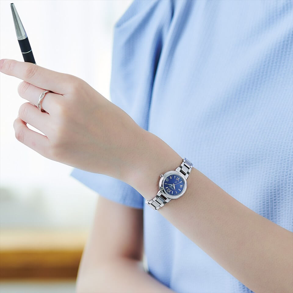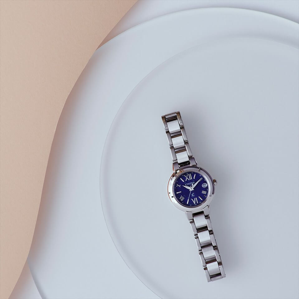 basic collectionの人気モデルから、知的で爽やかな印象が魅力的なネイビー文字板が登場しました。透き通る花びらの重なりをイメージした文字板と、草花のようにのびやかでやわらかな印象のインデックス。光の角度によって淡く繊細に浮き出る花びらのパターンが、女性らしい手元を演出します。