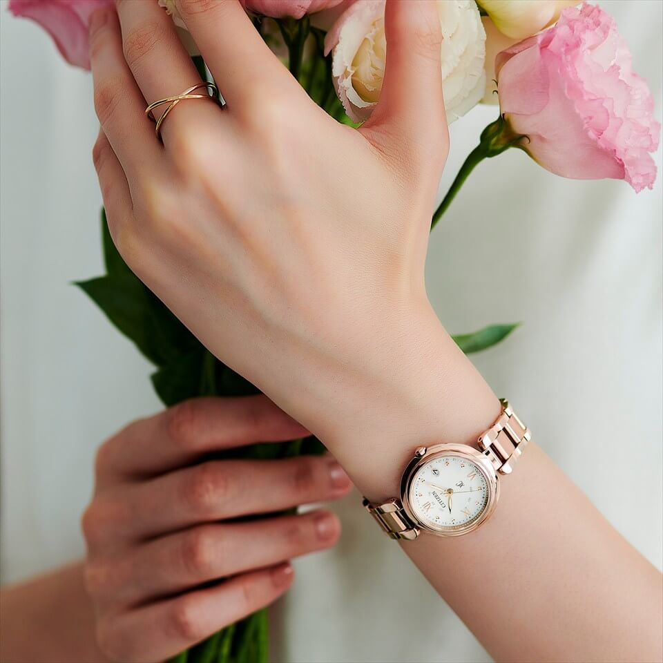 人気のサクラピンクモデルは、パールホワイトの文字板カラーで女性らしくやさしい印象のモデルに仕上げました。