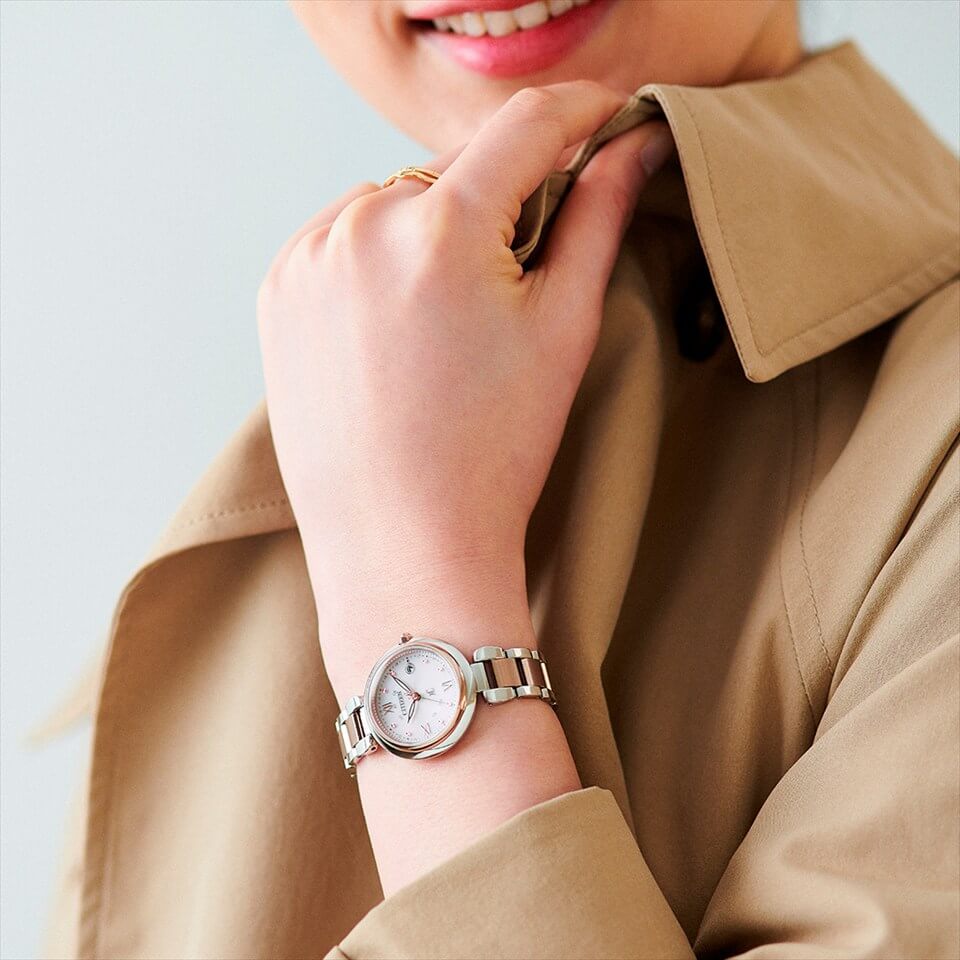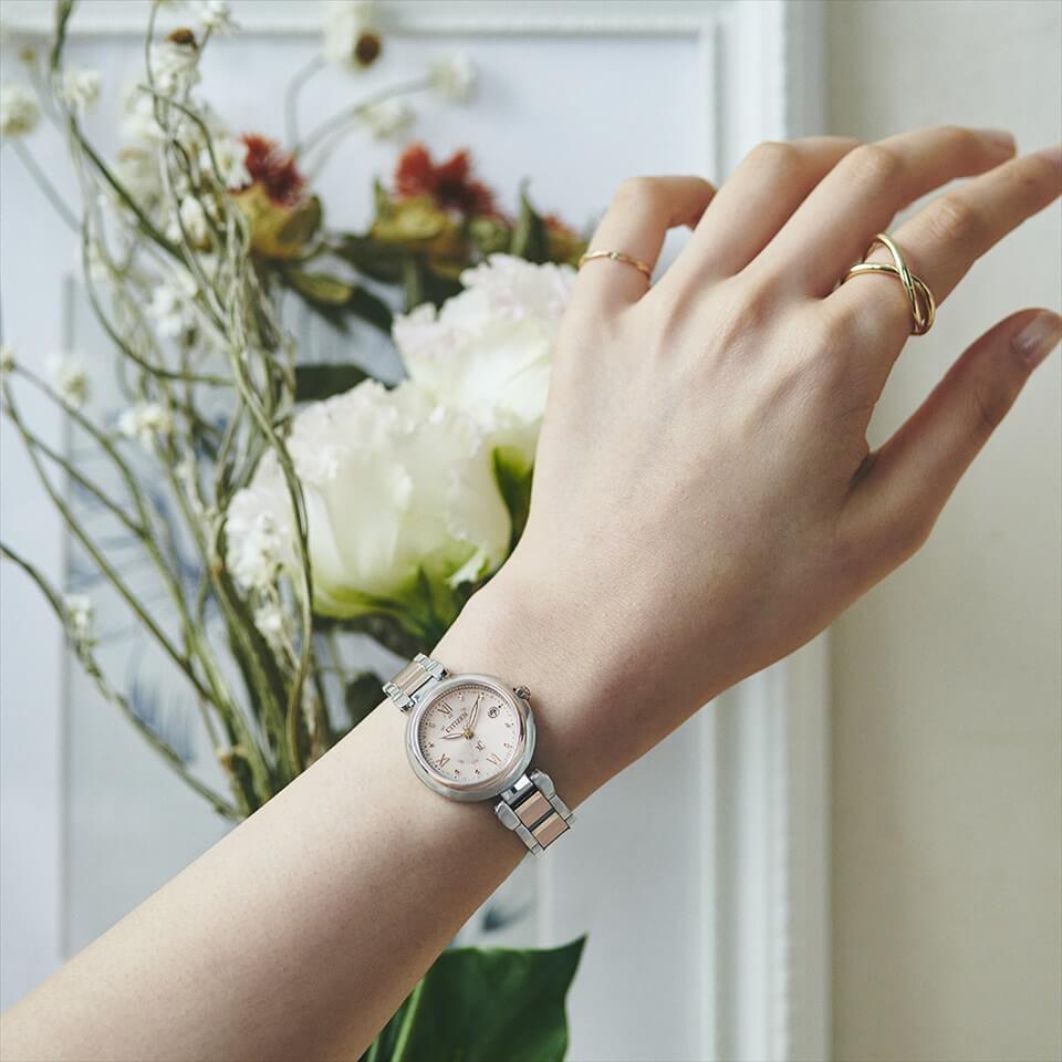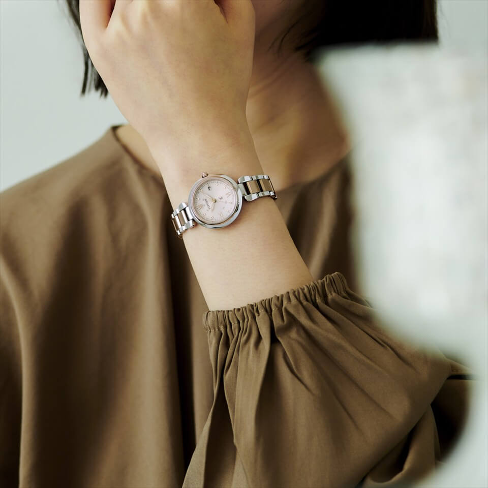 水面の波紋を思わせる、優しく丸みのあるベゼルとケースライン。雫に見立てたミルグレインをあしらった、ミルグレインドロップガラス。文字板には露のようにさりげなくレイアウトされたカットパーツ。透明感あふれる、美しく柔らかい表情が印象的なmizu collection。