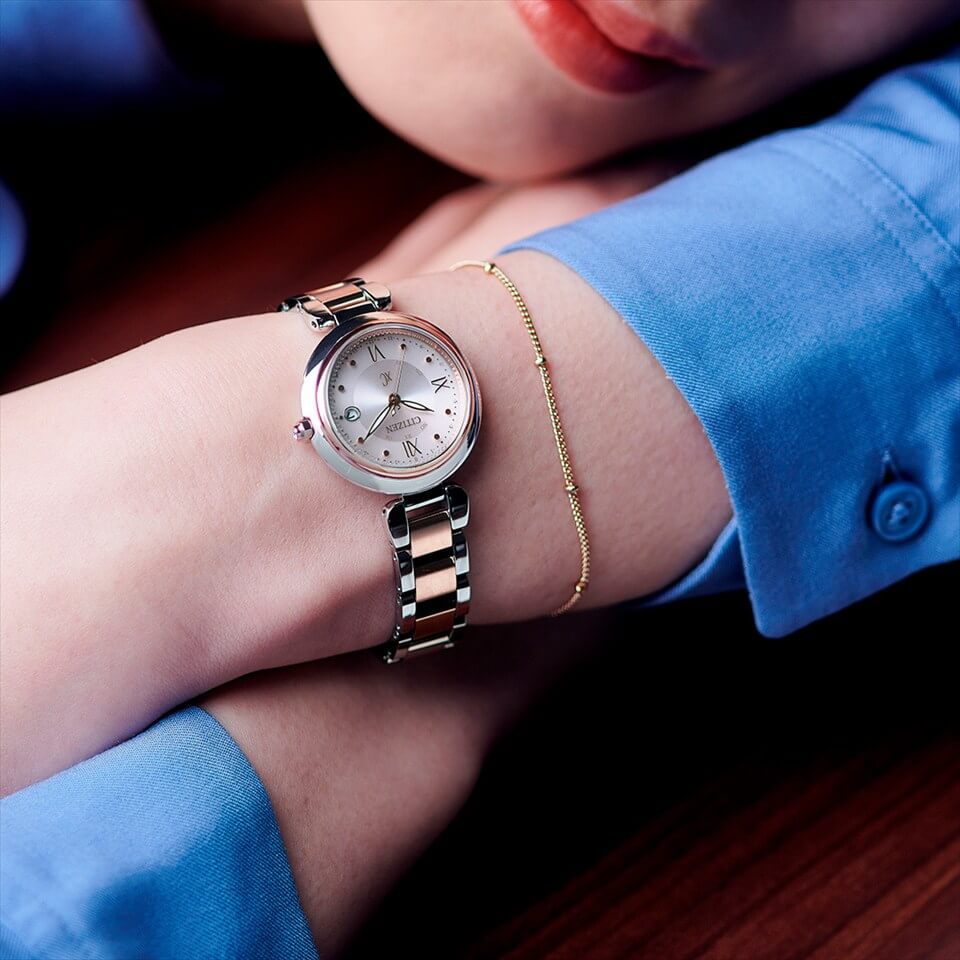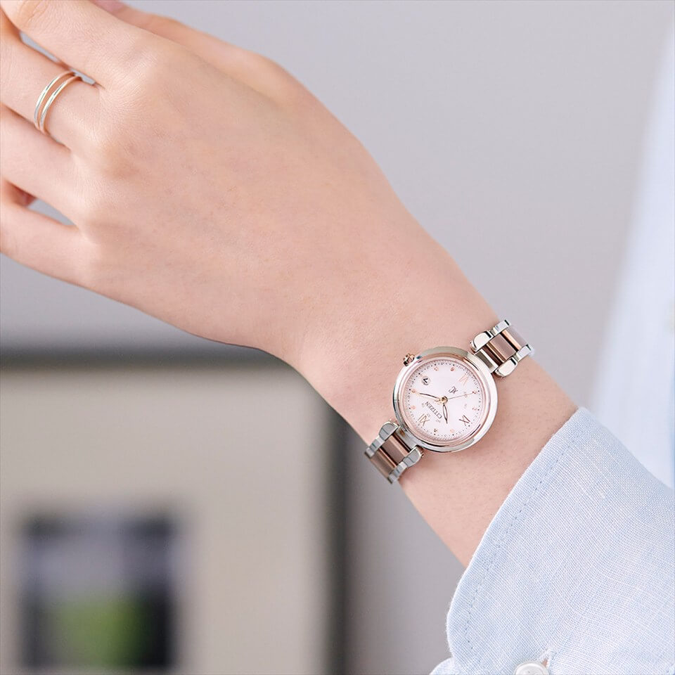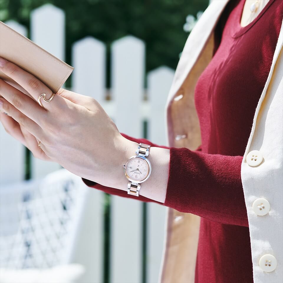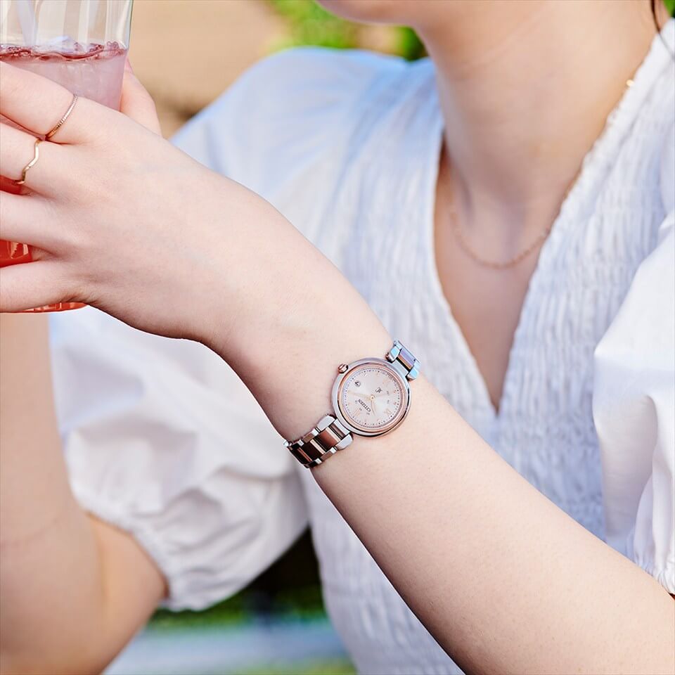水面の波紋を思わせる、優しく丸みのあるベゼルとケースライン。雫に見立てたミルグレインをあしらった、ミルグレインドロップガラス。文字板には露のようにさりげなくレイアウトされたカットパーツ。透明感あふれる、美しく柔らかい表情が印象的なmizu collection。