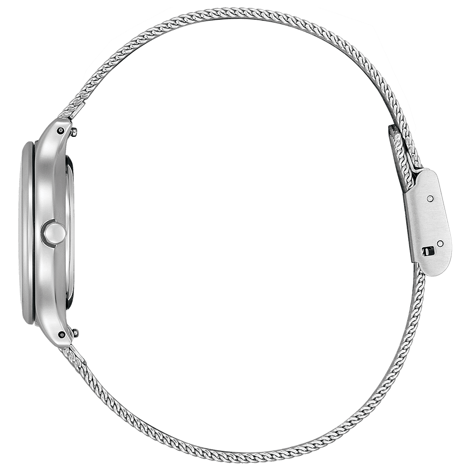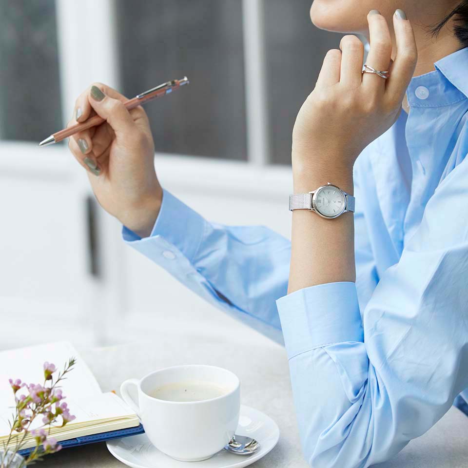 ご自分で簡単にバンド交換ができるチェンジャブル仕様。革バンド用バックルがセットになっているため、お好みのバンド(別売り)に付け替えて、その日の気分やファッションにあわせて、多彩なコーディネートを楽しむことができます。ケースは、やさしく流れる水をイメージしたフローライン、持ち主の幸せを見守るモチーフとして外周部分に雫のようなミルグレインリングをあしらっています。12時のインデックスは、ゆるやかなデザインのローマ字フォント。軽やかに跳ねる雫のイメージをカットパーツとプリントで表現し、透明感あふれる上品なデザインに仕上げています。秒針の尾に雫のようなダイヤ形のアクセントをプラス。さりげないディテールが、心をくすぐります。