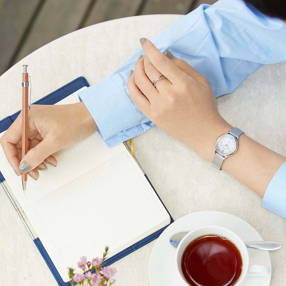光発電『エコ・ドライブ』は、太陽光や室内のわずかな光を電気に換え、時計を動かしつづけるシチズン独自の技術です。一度フル充電すれば、光のないところでも長時間動き続けるので、定期的な電池交換は必要ありません。