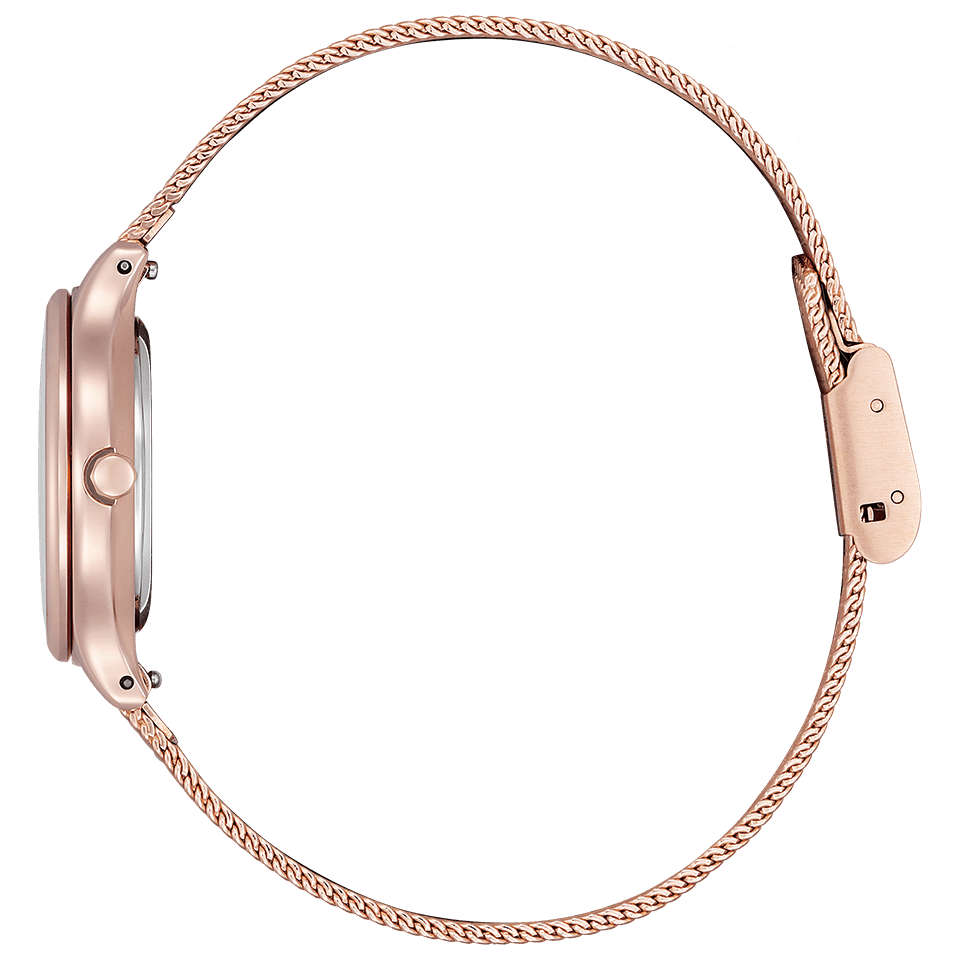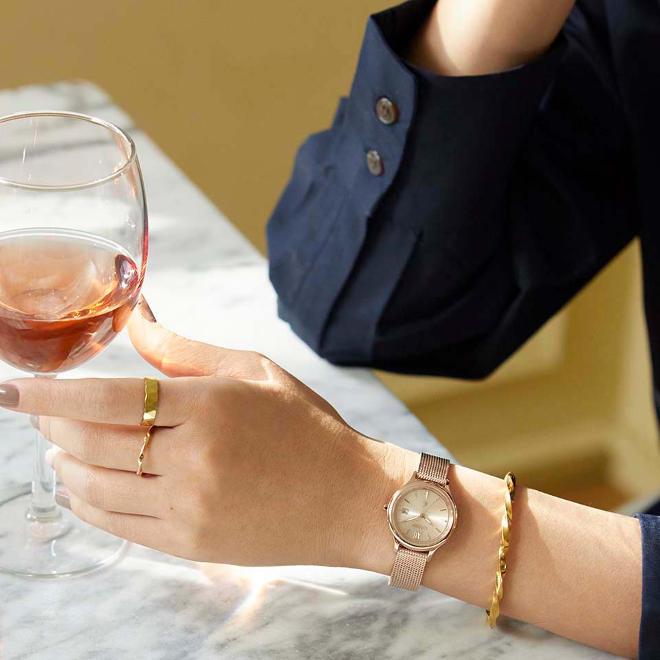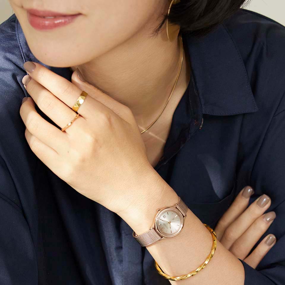ご自分で簡単にバンド交換ができるチェンジャブル仕様。革バンド用バックルがセットになっているため、お好みのバンド(別売り)に付け替えて、その日の気分やファッションにあわせて、多彩なコーディネートを楽しむことができます。ケースは、やさしく流れる水をイメージしたフローライン、持ち主の幸せを見守るモチーフとして外周部分に雫のようなミルグレインリングをあしらっています。12時のインデックスは、ゆるやかなデザインのローマ字フォント。軽やかに跳ねる雫のイメージをカットパーツとプリントで表現し、透明感あふれる上品なデザインに仕上げています。秒針の尾に雫のようなダイヤ形のアクセントをプラス。さりげないディテールが、心をくすぐります。