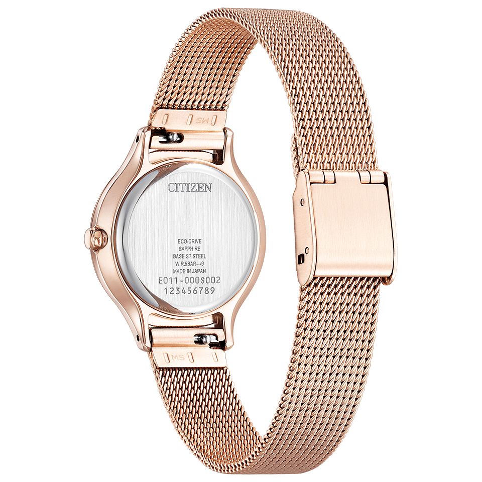 光発電『エコ・ドライブ』は、太陽光や室内のわずかな光を電気に換え、時計を動かしつづけるシチズン独自の技術です。一度フル充電すれば、光のないところでも長時間動き続けるので、定期的な電池交換は必要ありません。