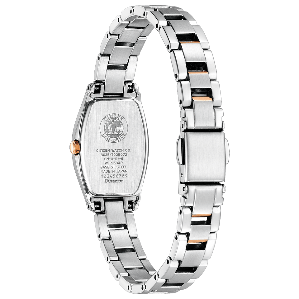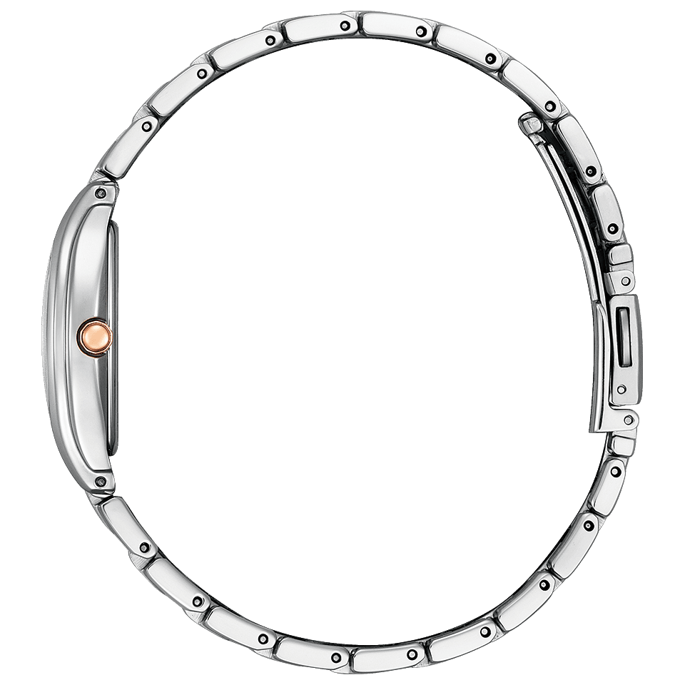 華奢でエレガントな長角ケースのエコ・ドライブモデル。ケースサイドのフローラインがしなやかな女性らしさを表現しています。文字板のインデックスには柔らかい印象のローマ数字を採用。時分秒針の3針なので、時間も見やすく実用的なモデルです。バンドは長さ調整が手軽なシンプルアジャストバンド。