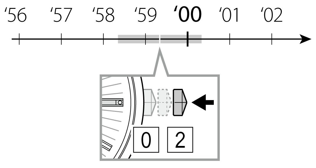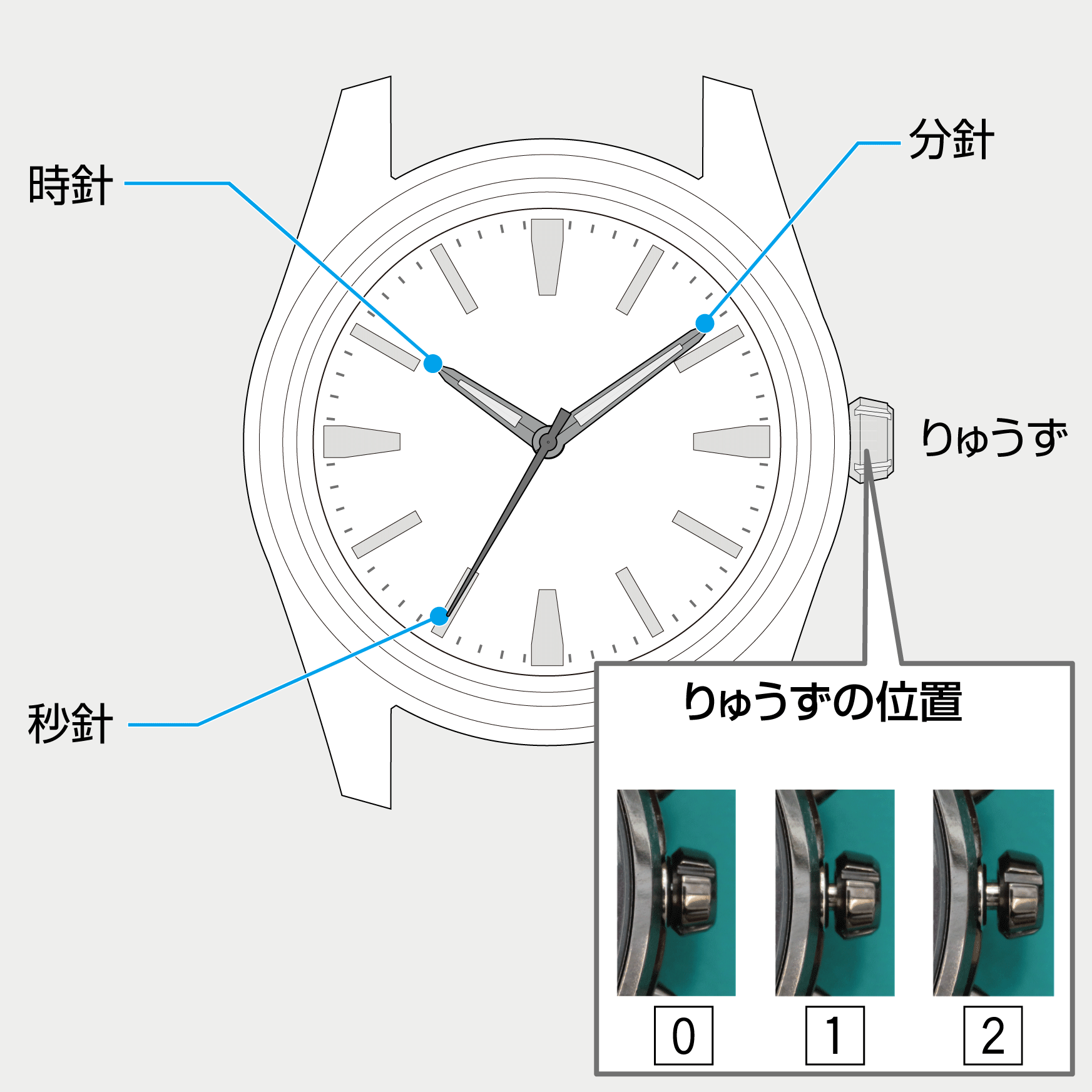 - 秒針が0秒を指しているときに、りゅうずの位置を2にする