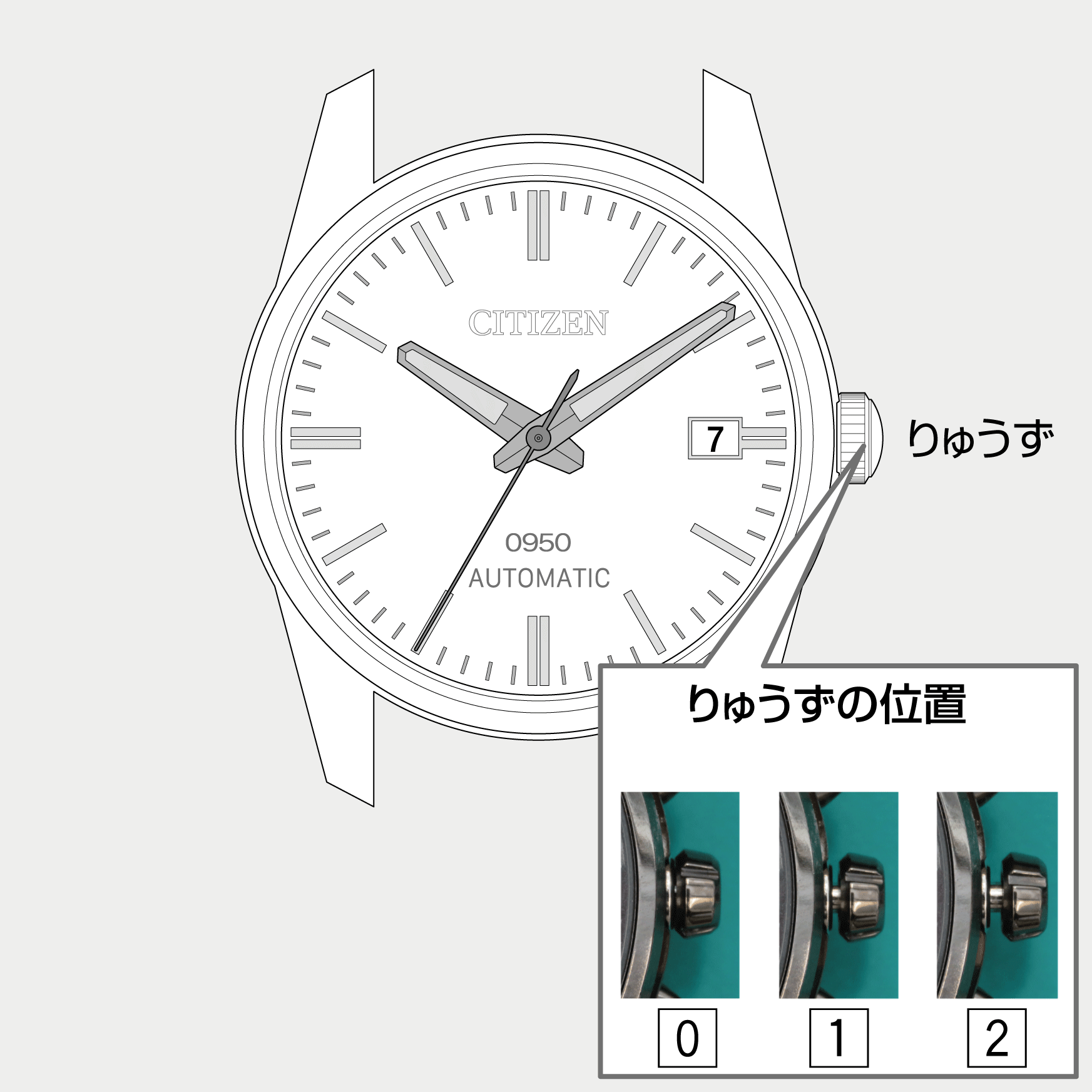 - 秒針が0秒を指しているときに、りゅうずの位置を2にする