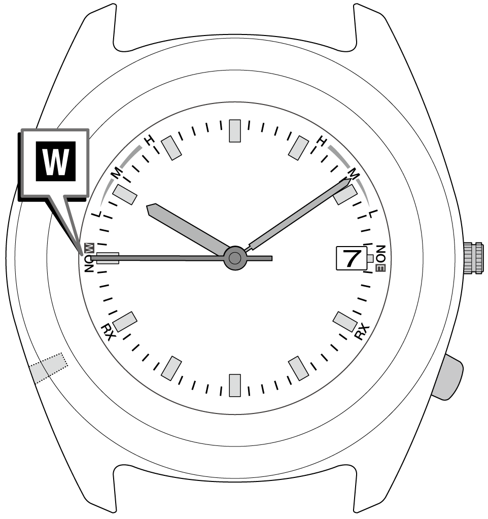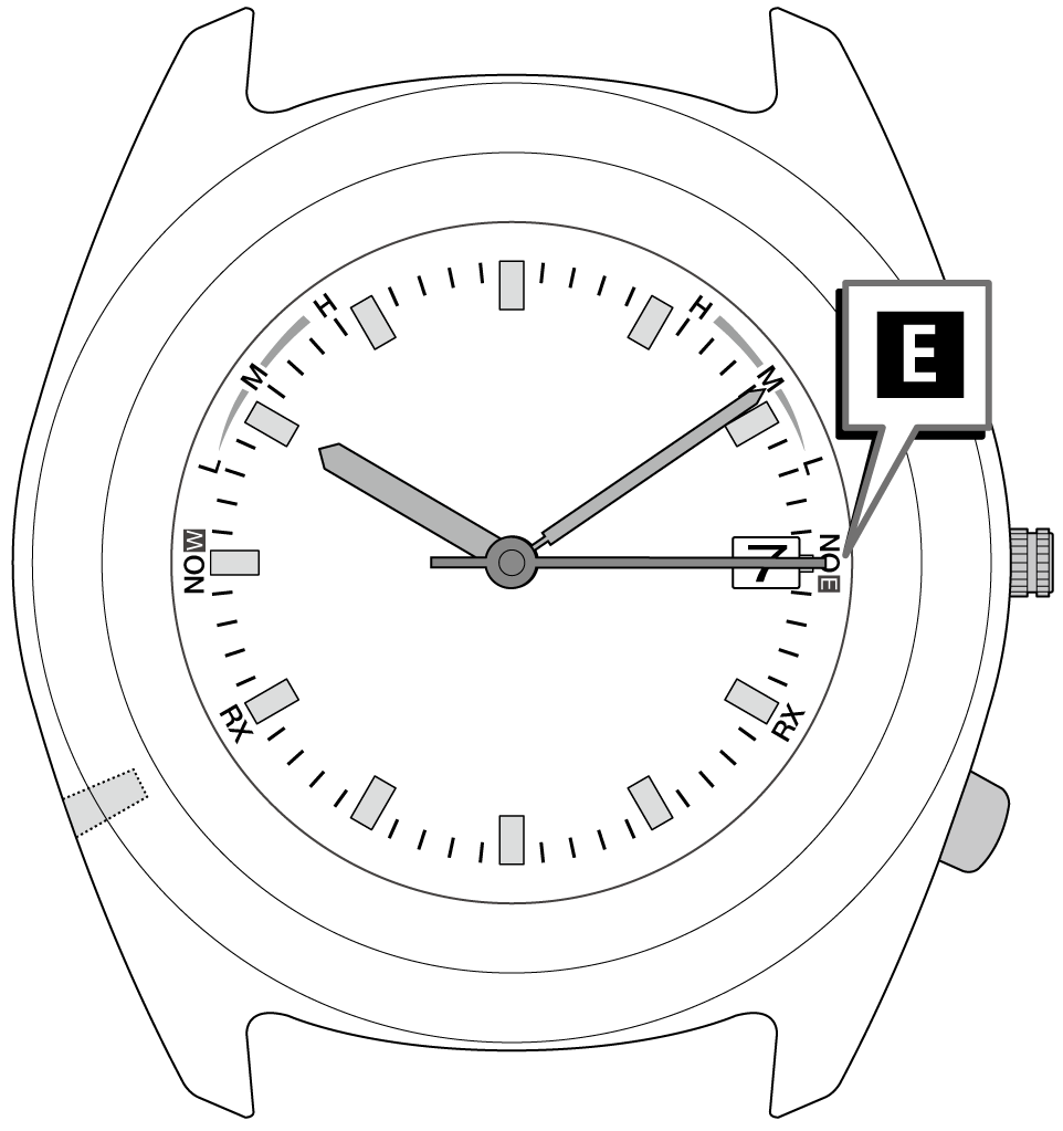 秒針が、現在の設定(E/W)を指します。